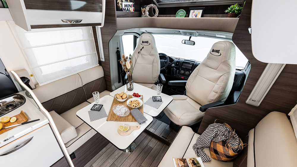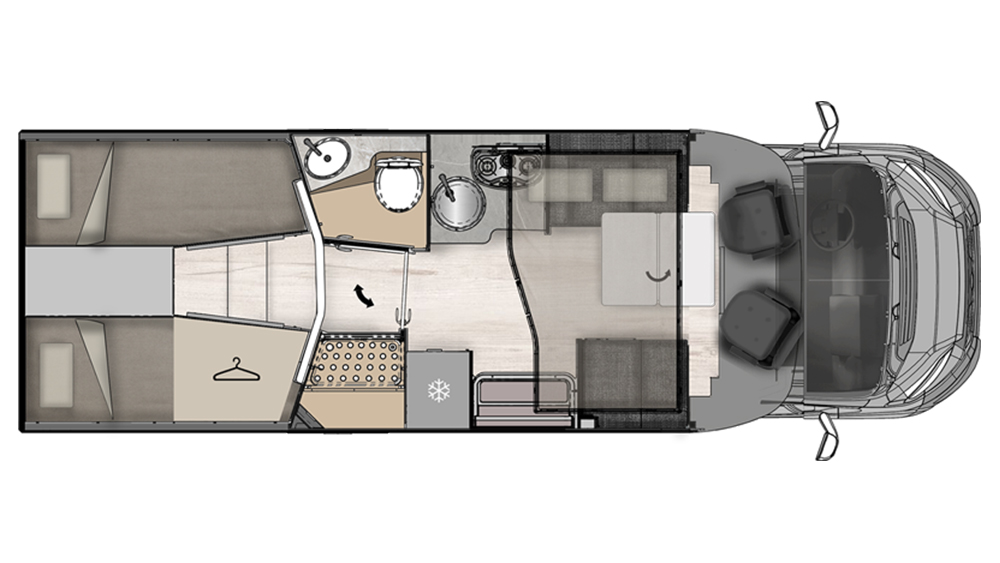 All'interno, l'ambiente accogliente è arricchito da sedili girevoli per la cabina del guidatore e del passeggero, permettendo di creare una zona conviviale attorno al tavolo dinette. I posti letto sono pensati per il massimo comfort, con letti supplementari e una disposizione flessibile per ospitare fino a 4 persone più un eventuale ospite aggiuntivo.