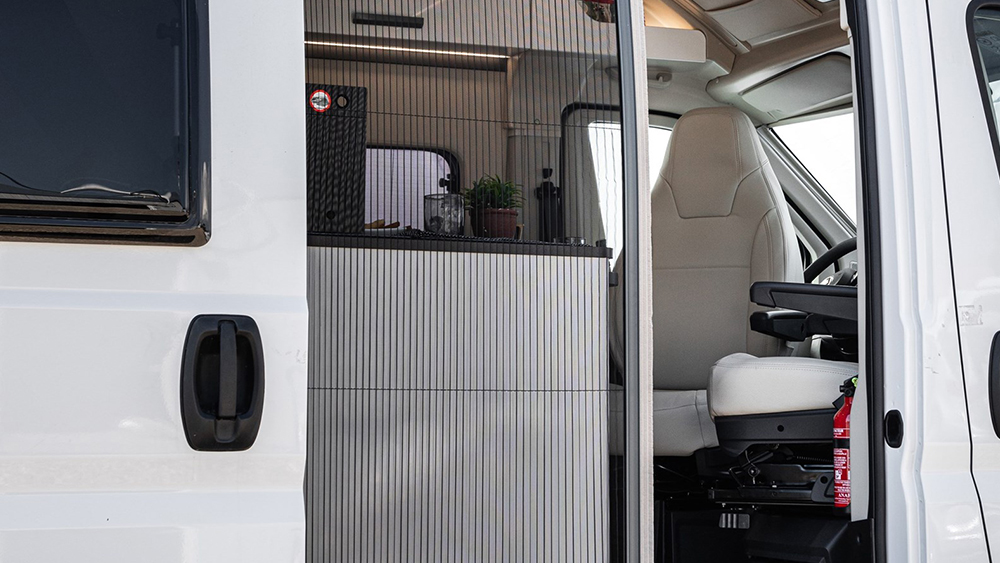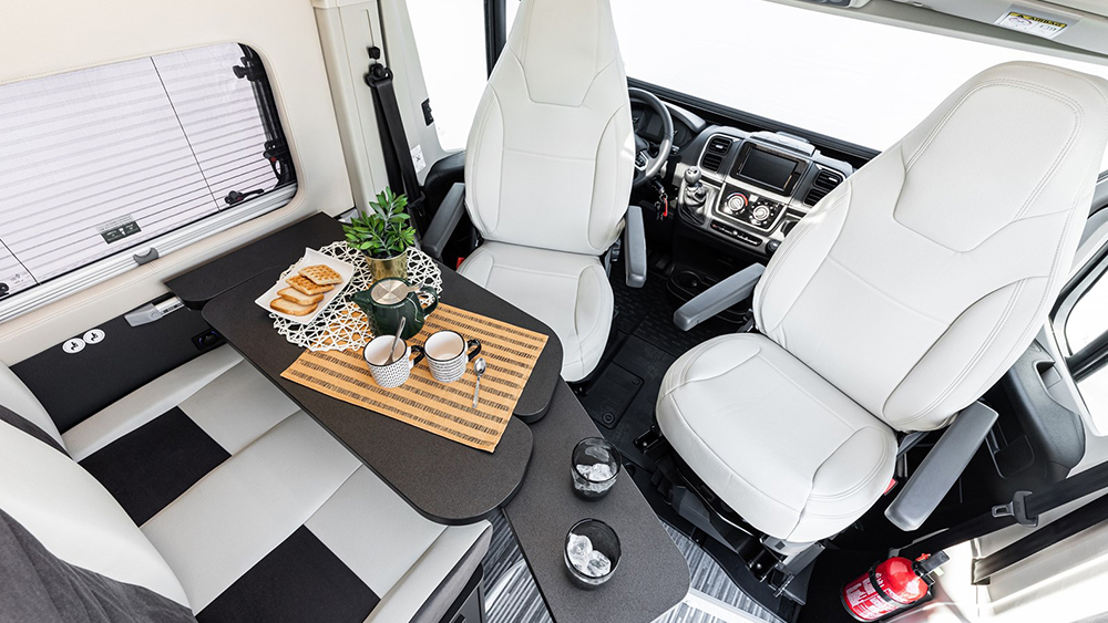 Il veicolo misura 541 cm in lunghezza, 205 cm in larghezza e 265 cm in altezza esterna, con un'altezza interna di 189 cm, offrendo un'ottima abitabilità interna. La cabina dispone di sedili girevoli sia per il conducente che per il passeggero, mentre il cruise control con limitatore di velocità assicura una guida rilassata e sicura.