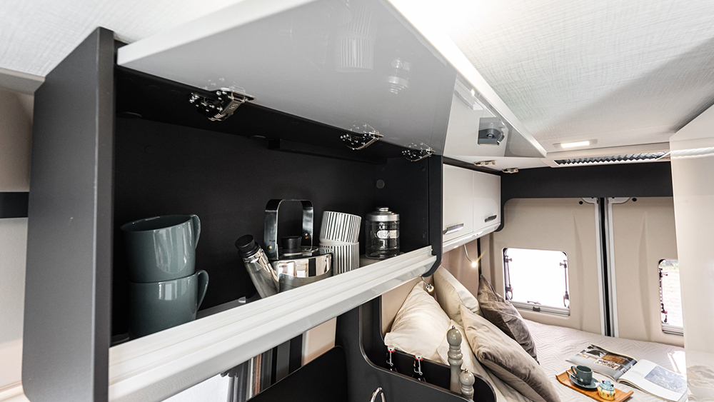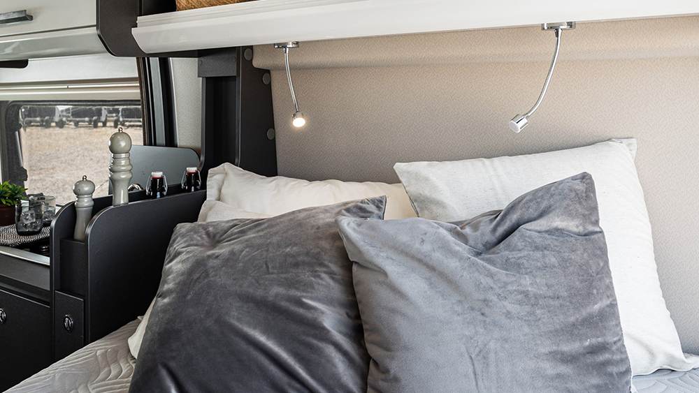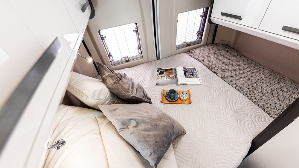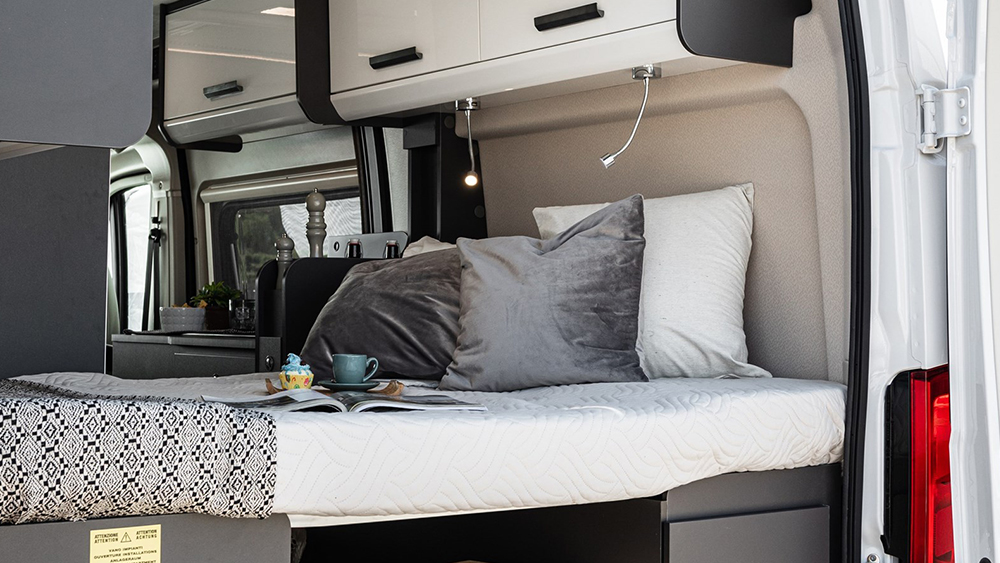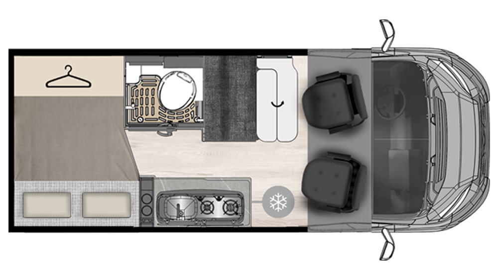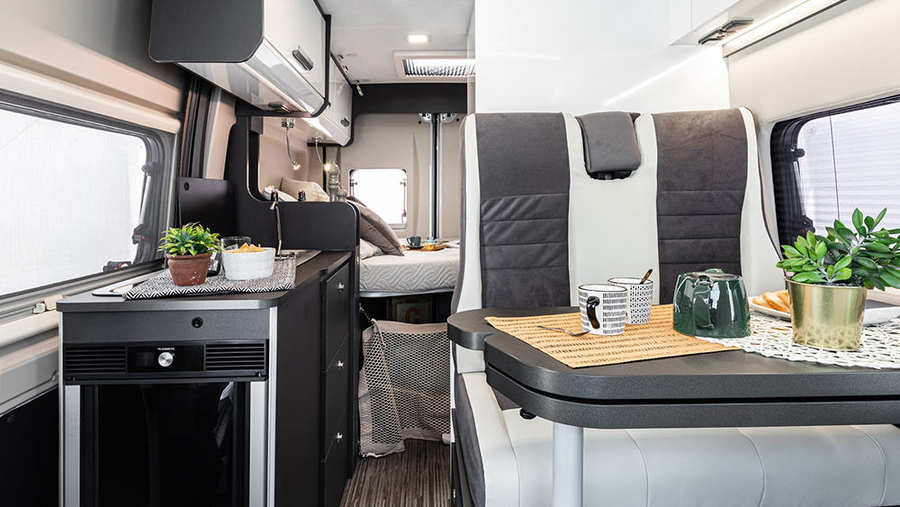 L'allestimento interno include una dinette con estensione del tavolo e un frigorifero a compressore da 70 litri, mentre la zona notte è dotata di un letto posteriore di 186x132 cm (riducibile a 116 cm). Gli oblò, tra cui uno da 400x400 mm e uno panoramico opzionale da 700x500 mm, permettono un'illuminazione naturale ottimale.