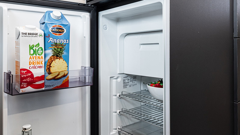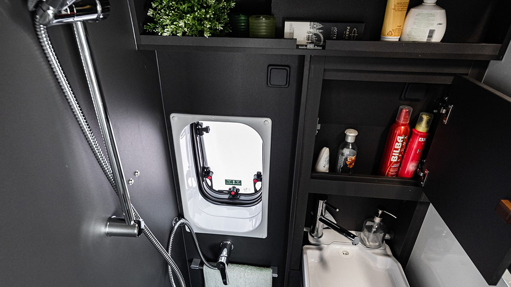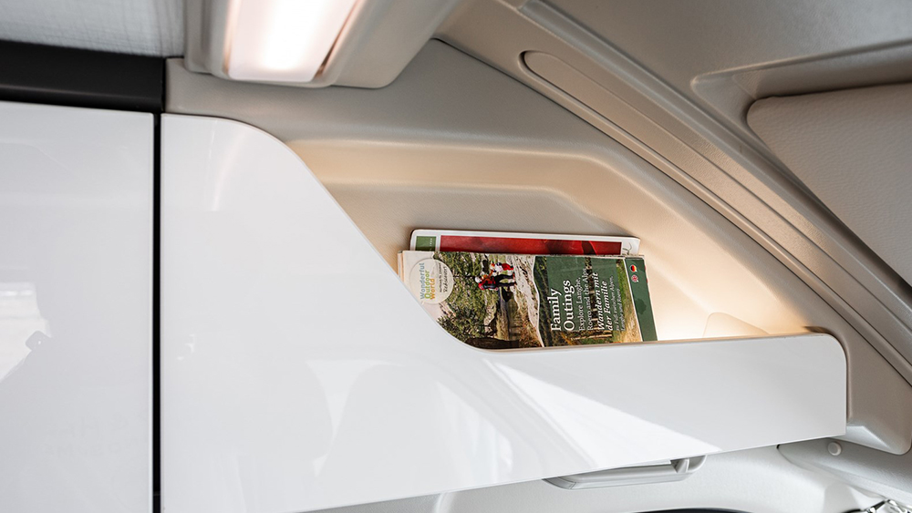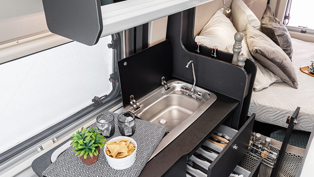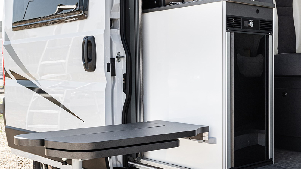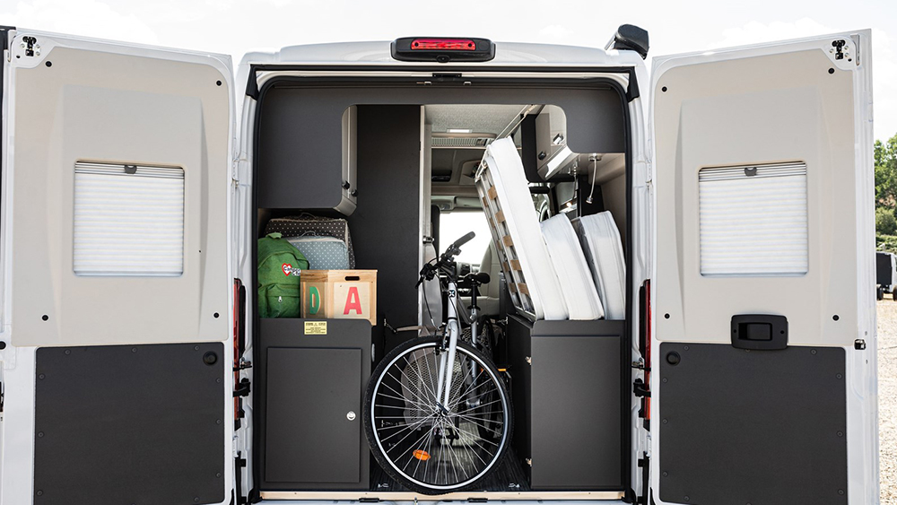 L'allestimento interno include una dinette con estensione del tavolo e un frigorifero a compressore da 70 litri, mentre la zona notte è dotata di un letto posteriore di 186x132 cm (riducibile a 116 cm). Gli oblò, tra cui uno da 400x400 mm e uno panoramico opzionale da 700x500 mm, permettono un'illuminazione naturale ottimale.
