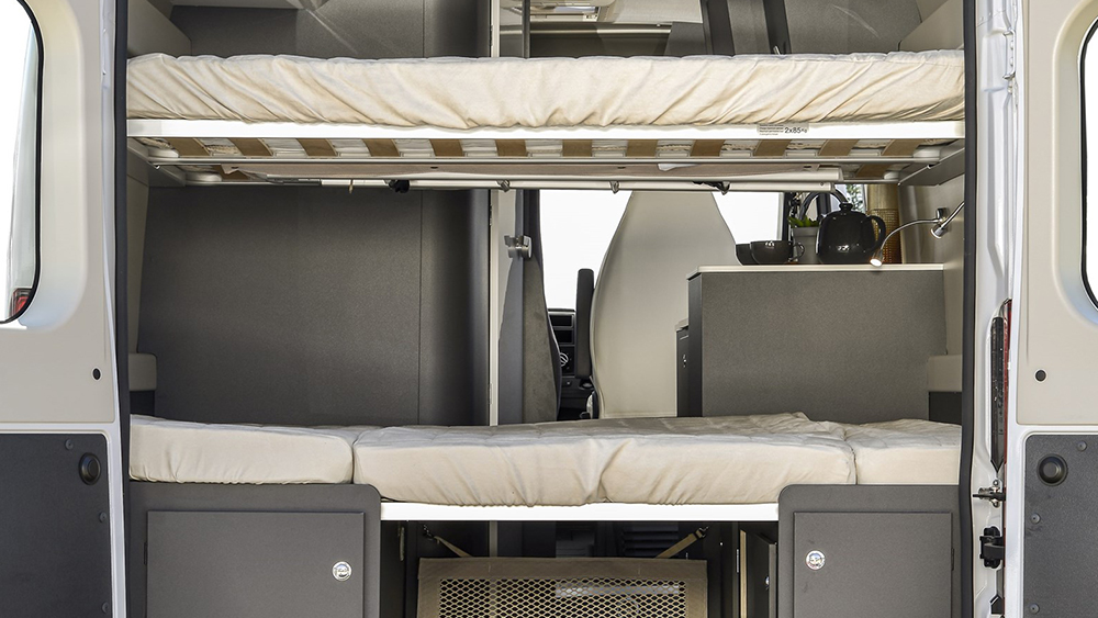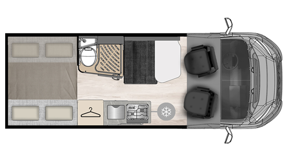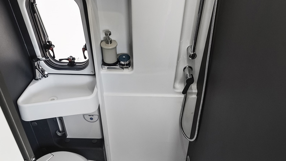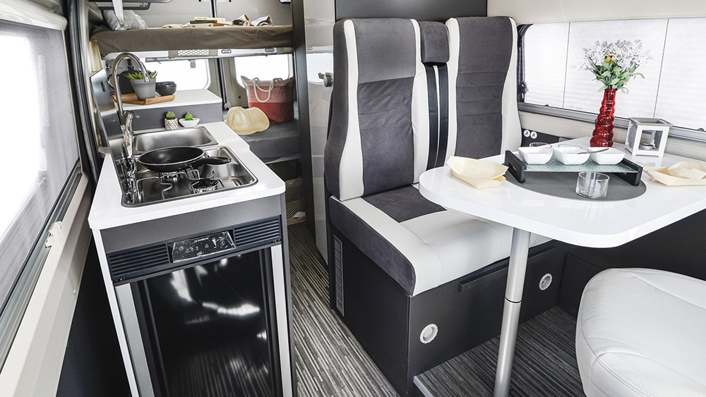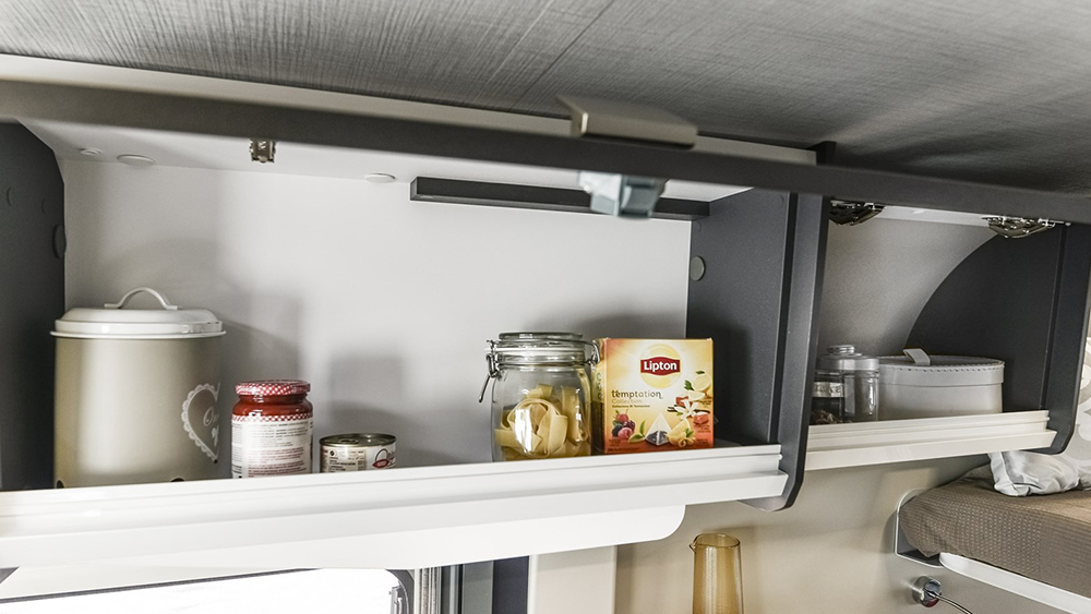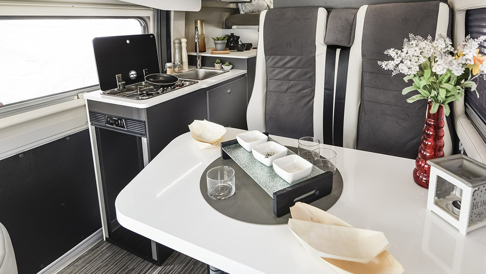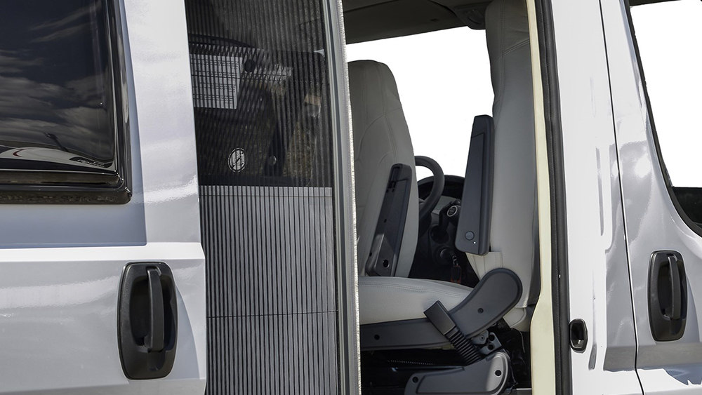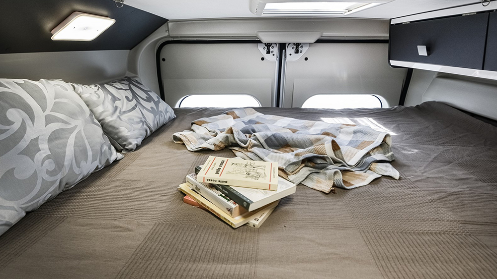 Gli esterni sono altrettanto impressionanti, con una retrocamera per facilitare le manovre, un gradino elettrico di accesso alla cellula per comodità aggiuntiva e una zanzariera per il portellone laterale per godersi l'aria fresca senza fastidi. All'interno, dettagli come le fodere dei sedili cabina, gli oblò panoramici e l'estensione del tavolo dinette creano un ambiente accogliente e funzionale.
