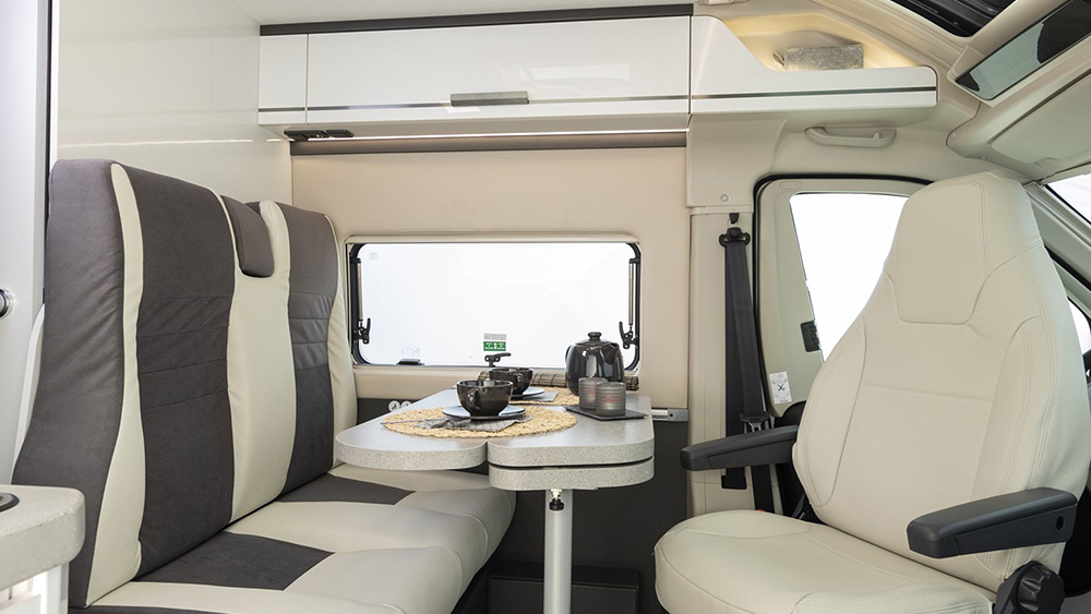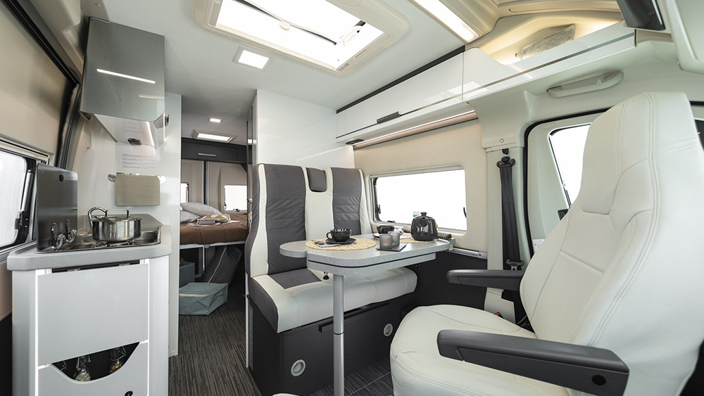 Gli interni sono progettati per offrire il massimo comfort durante i lunghi viaggi. I sedili girevoli nella cabina del guidatore e del passeggero consentono di ottimizzare lo spazio e di creare un ambiente accogliente e conviviale. Il climatizzatore manuale assicura una temperatura piacevole all'interno del camper, indipendentemente dalle condizioni climatiche esterne.