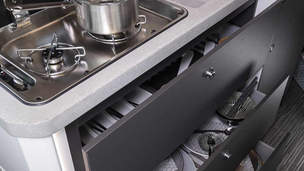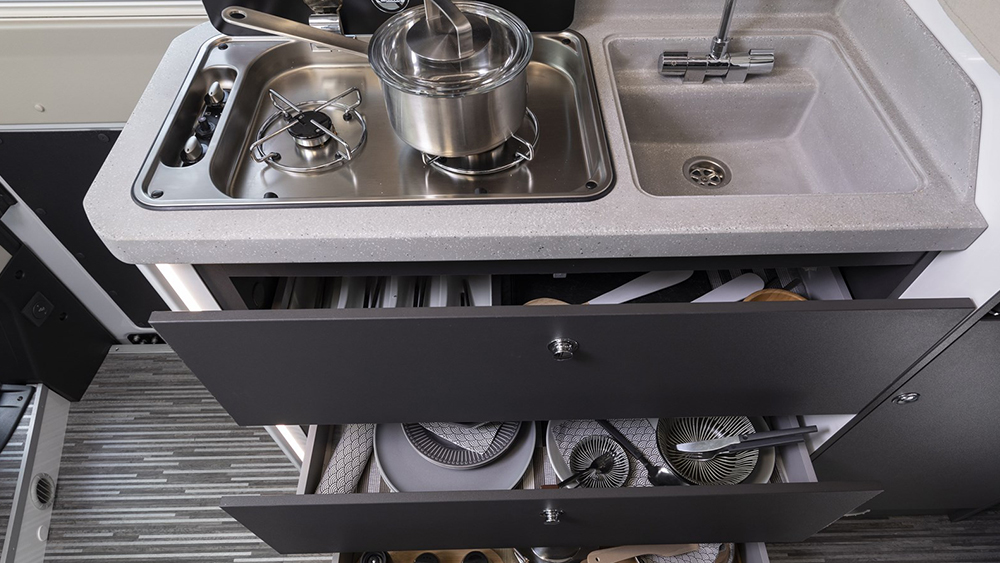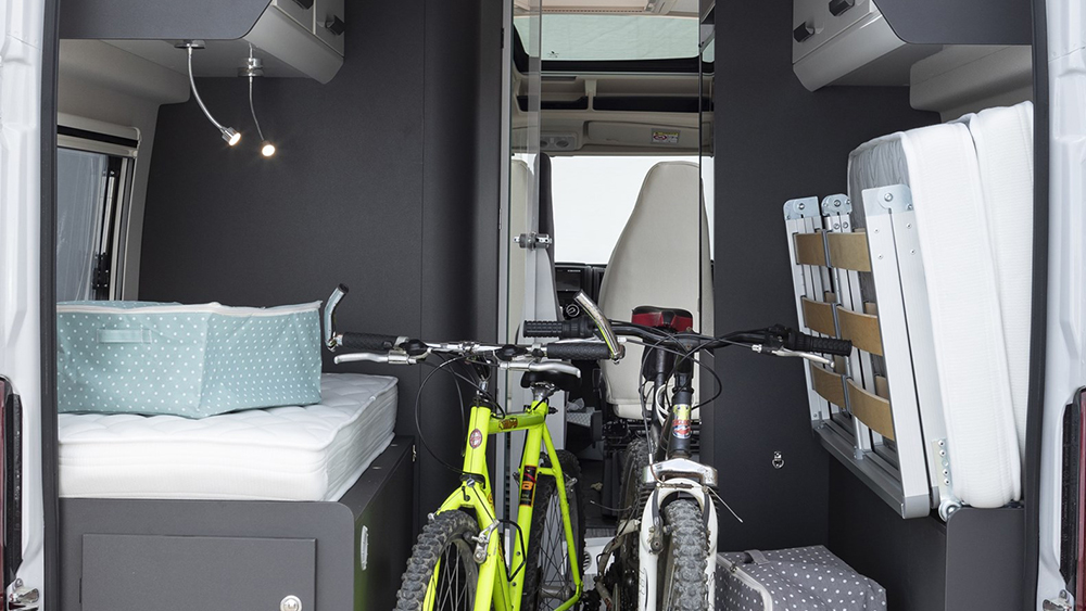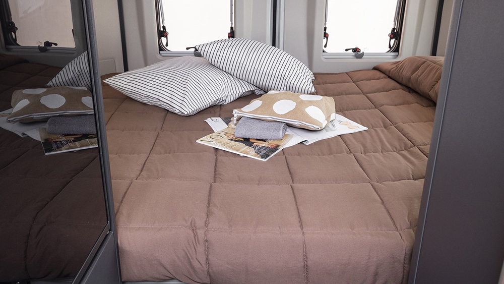 Gli esterni del camper sono altrettanto impressionanti, con una retrocamera per facilitare le manovre e un gradino elettrico di accesso alla cellula per un ingresso senza sforzo. La zanzariera per il portellone laterale assicura serate tranquille e senza fastidi.