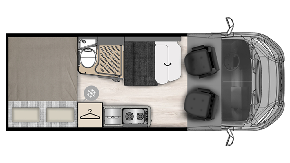 Con una lunghezza di 5995 mm e una larghezza di 2050 mm, il Menfys 3 Prestige offre ampio spazio interno senza compromettere la maneggevolezza. Il letto posteriore di dimensioni generose (186x149 cm) assicura un riposo confortevole, mentre la dinette trasformabile offre un letto supplementare per gli ospiti occasionali.