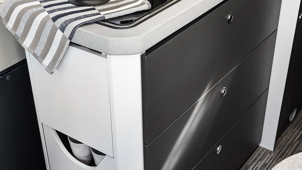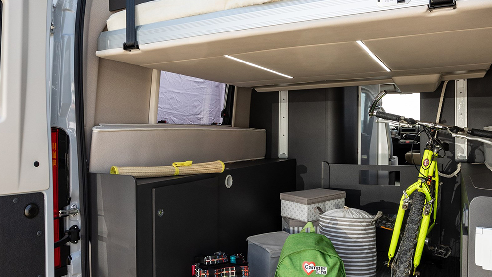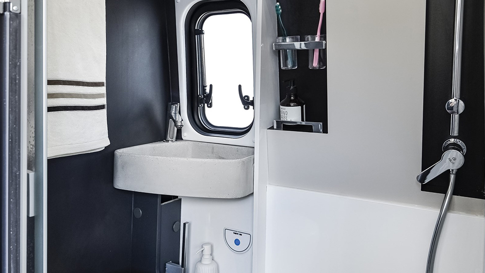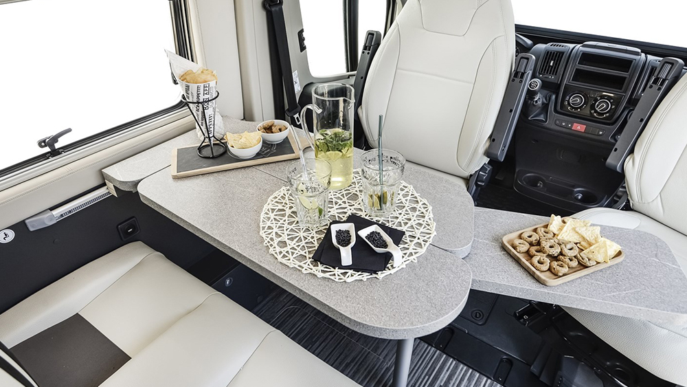 Gli esterni sono altrettanto ben curati, con una retrocamera per facilitare le manovre, un gradino elettrico di accesso alla cellula per un ingresso agevole e una zanzariera per il portellone laterale per godere della brezza senza fastidi. All'interno, gli oblò di diverse dimensioni e la possibilità di estendere il tavolo della dinette garantiscono un ambiente luminoso e spazioso.