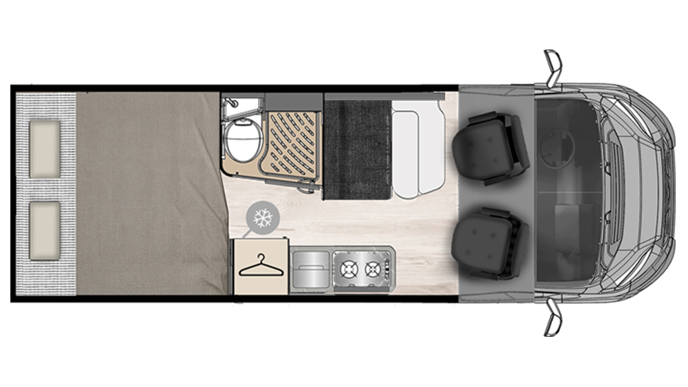 Con una lunghezza di 6365 mm e una larghezza di 2050 mm, offre spazio sufficiente per muoversi liberamente all'interno. Il letto posteriore generoso, con dimensioni di 185(175) x 160(190) cm, assicura un riposo confortevole, mentre la possibilità di aggiungere un letto supplementare dalla dinette trasformabile offre flessibilità per ospitare eventuali compagni di viaggio.