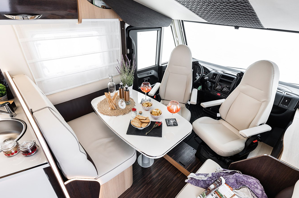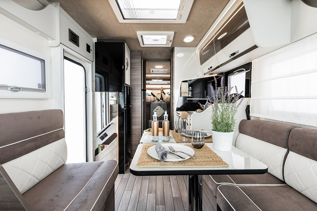 I dettagli curati, come i profili a LED, il rivestimento soft-touch sul soffitto, i tavoli laminati lucidi con gambe cromate o regolabili, e le grandi finestre e oblò, completano un ambiente esclusivo e confortevole. La Serie 800 è pensata per chi cerca un'esperienza di viaggio lussuosa e flessibile, con soluzioni adatte a ogni necessità.
