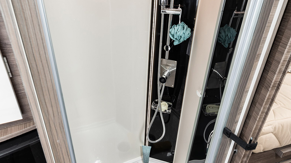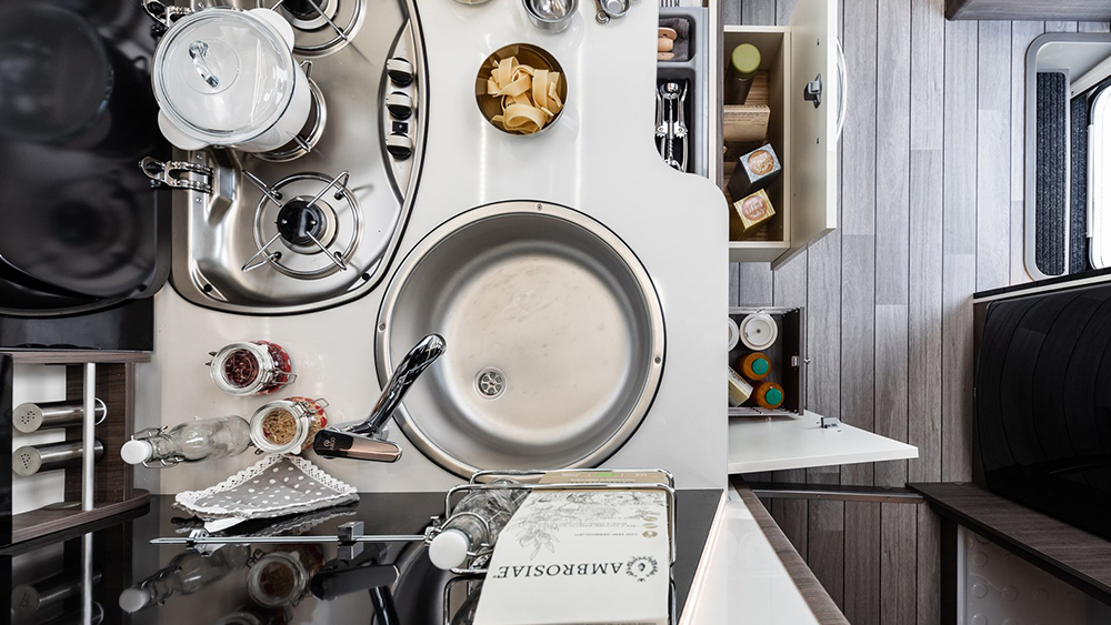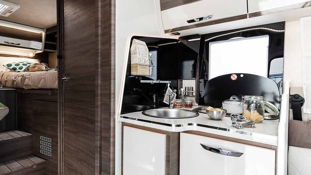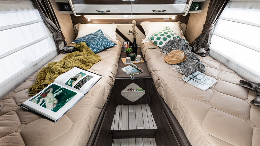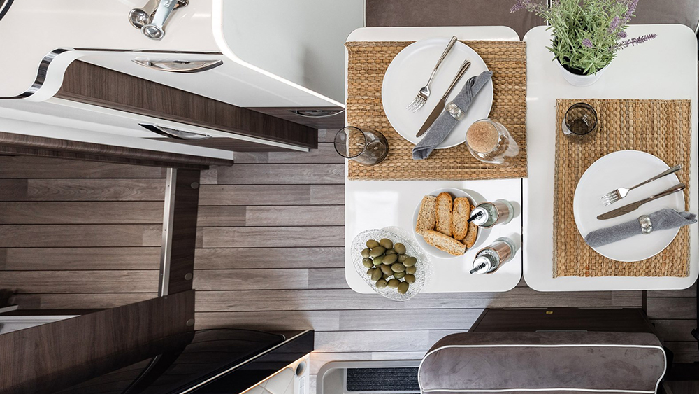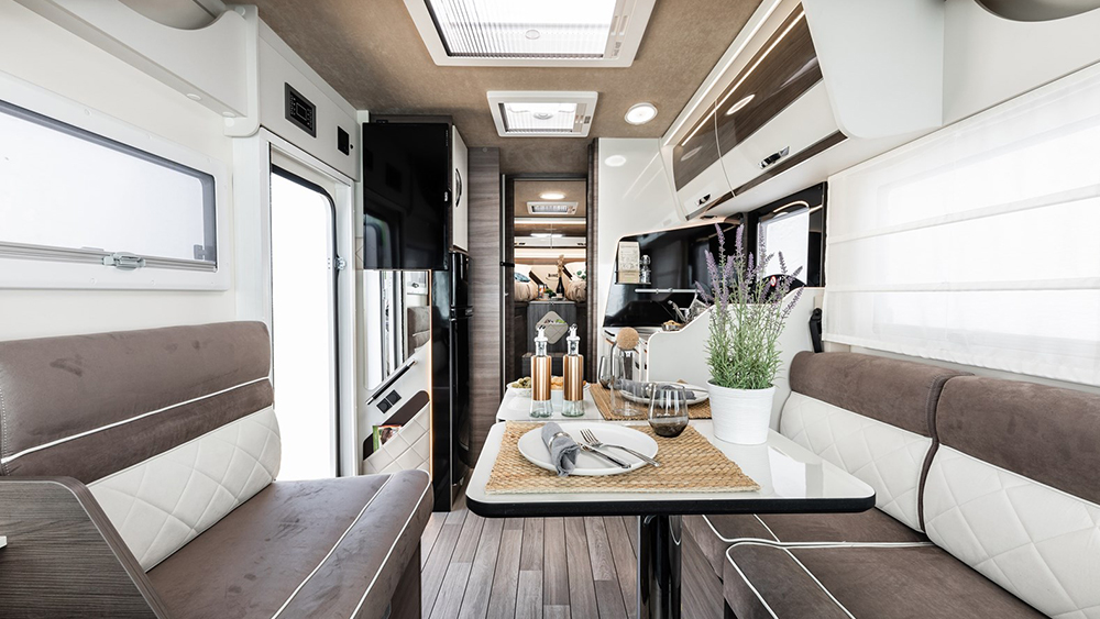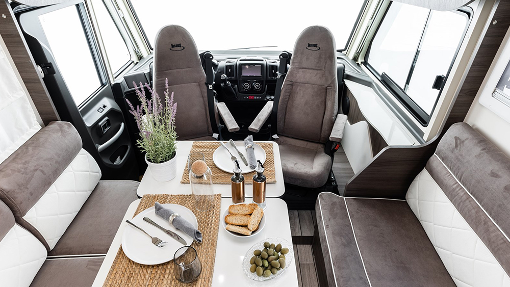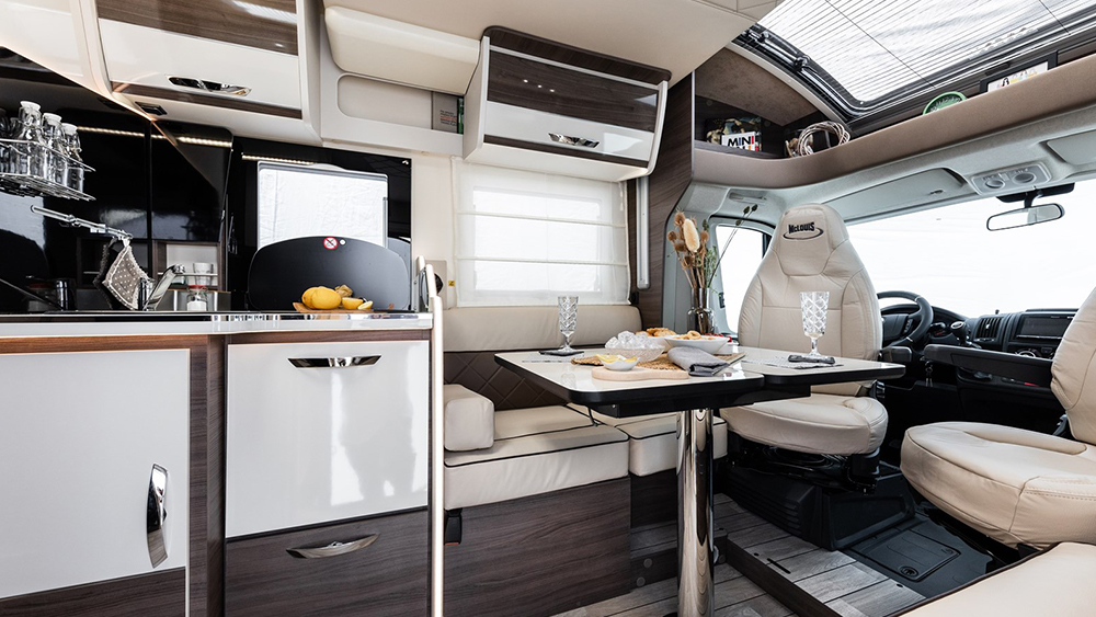 Gli interni sono arricchiti da dettagli di alta qualità, come le fodere dei sedili cabina e gli oblò con ventola che garantiscono una corretta ventilazione. La separazione interna tra giorno e notte offre privacy e tranquillità durante il riposo.