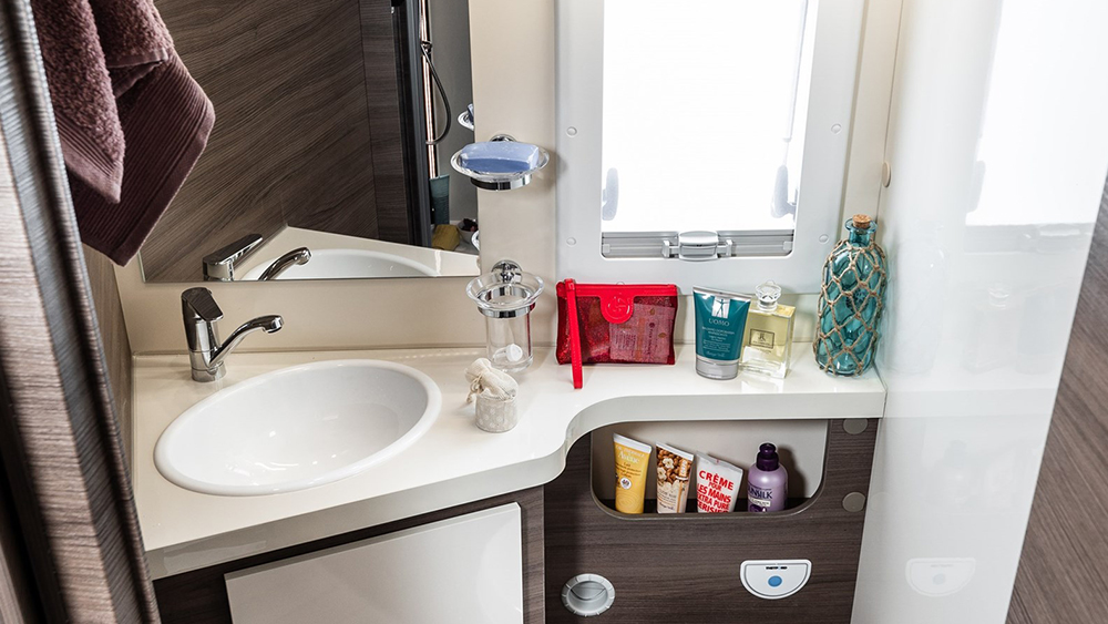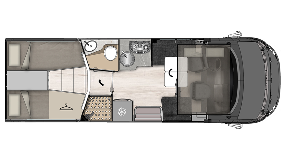 All'interno, gli spazi sono ben organizzati per massimizzare il comfort e la praticità. I posti letto sono quattro, con la possibilità di aggiungere un quinto letto opzionale. Il letto supplementare dalla dinette trasformabile offre flessibilità nello spazio notte, mentre il letto basculante assicura un riposo confortevole.