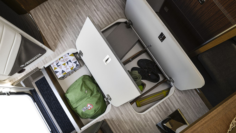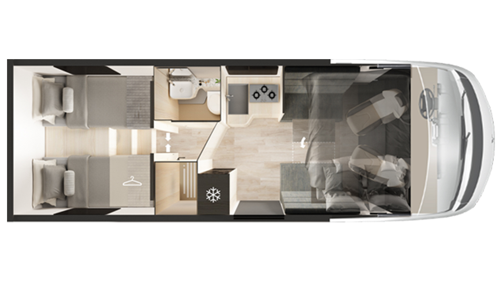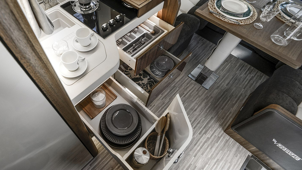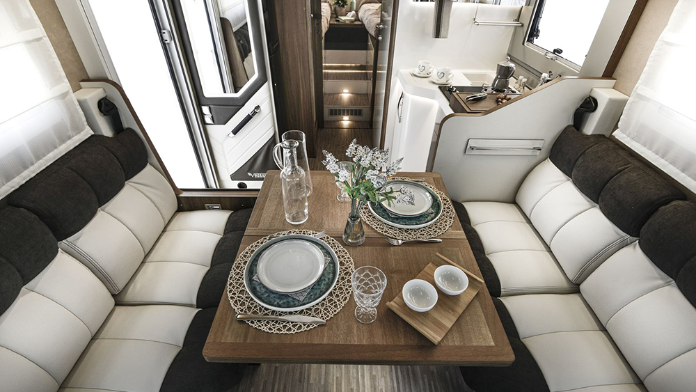 All'interno, l'abitabilità è caratterizzata da volumi generosi e ambienti multifunzionali che invitano al relax sia di giorno che di notte. Le finiture luminose e aerate creano uno spazio accogliente e confortevole, mentre la dinette offre la flessibilità di dimensioni e posizioni per adattarsi a ogni momento dell'avventura.
