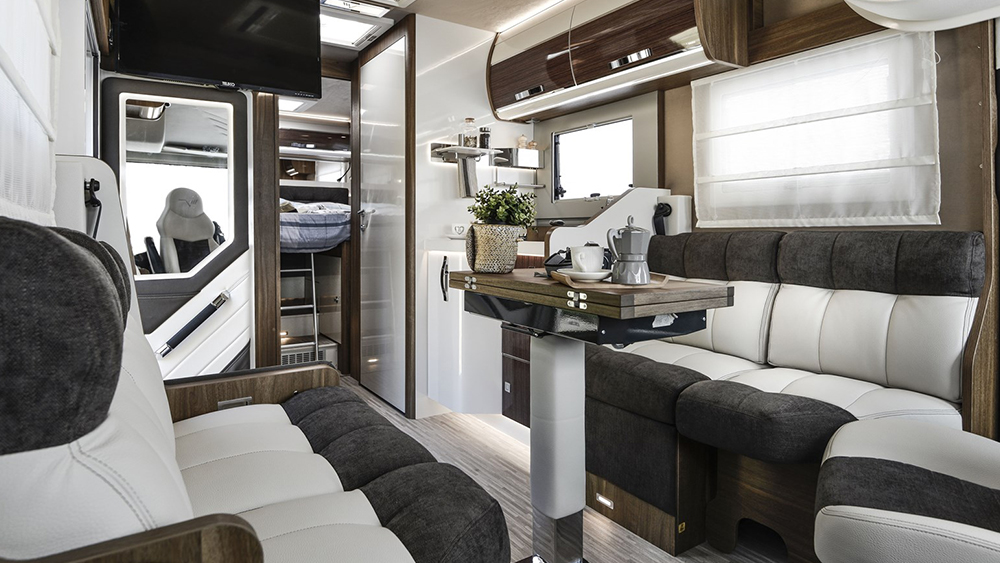 La luce naturale inonda gli interni attraverso un ampio skydome anteriore e numerose finestre, creando un'atmosfera luminosa e vivace. La gestione intelligente dello spazio assicura che ogni comfort sia ottimizzato, offrendo un perfetto equilibrio tra esterni e interni.