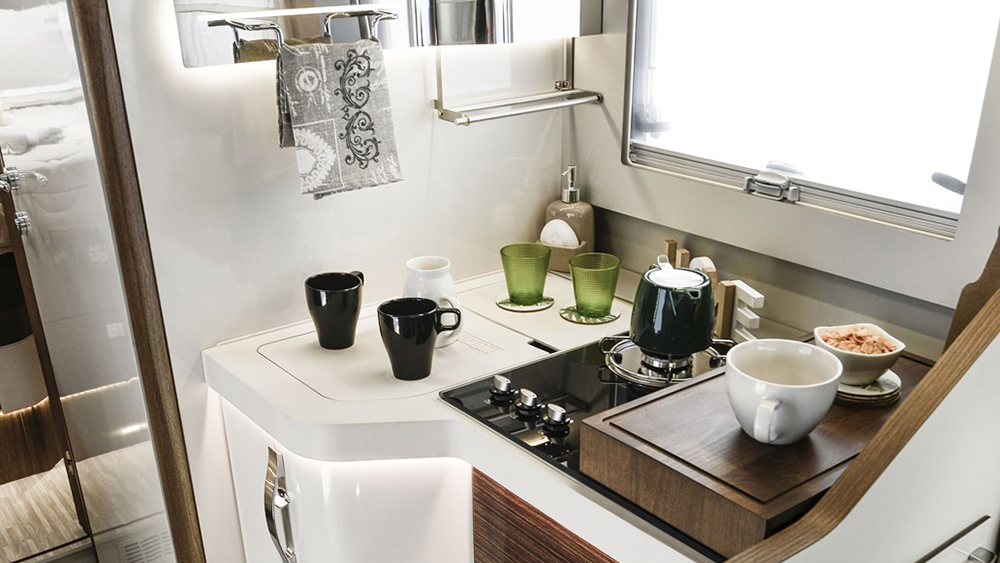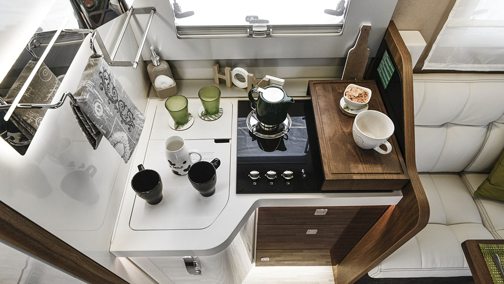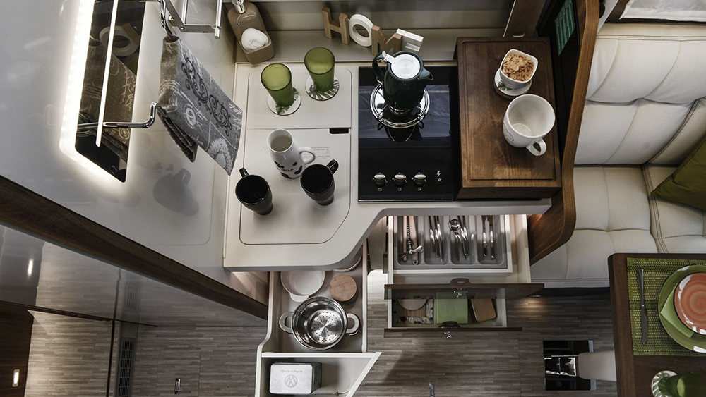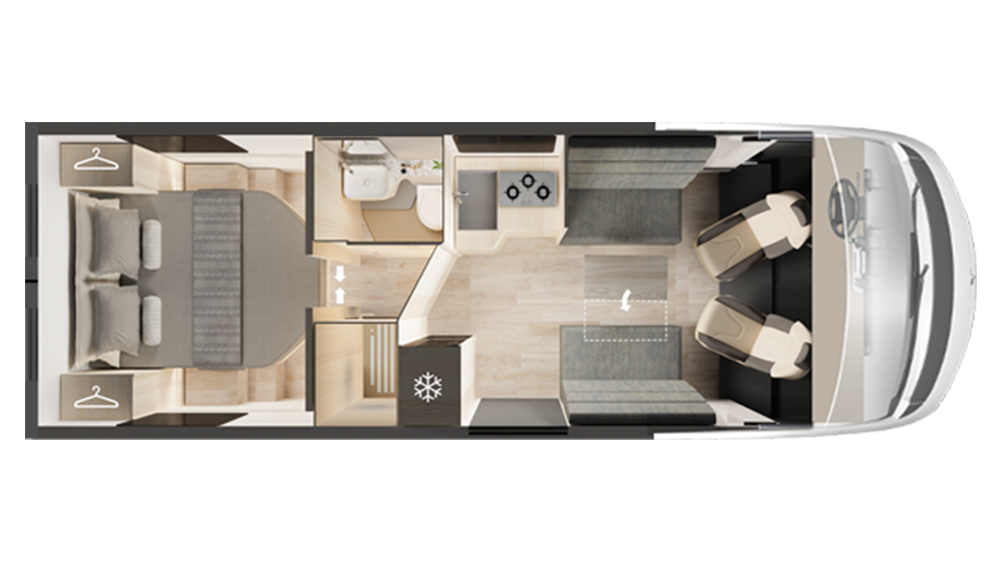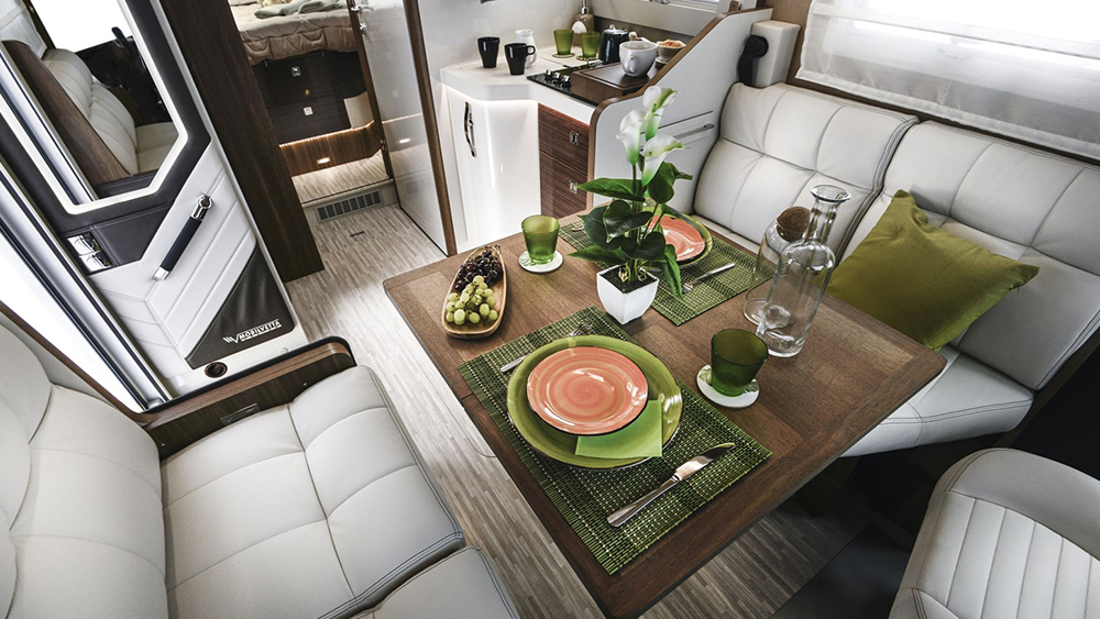 All'interno, lo spazio è organizzato per permetterti di stare insieme, ritrovarsi e evadere dalla routine quotidiana. La dinette è progettata per offrire il massimo comfort, con divani trasformabili e un tavolo a libro che si ripiega facilmente per ridurre l'ingombro. Il salotto offre anche una comoda chaise longue, ideale per rilassarsi durante il viaggio.