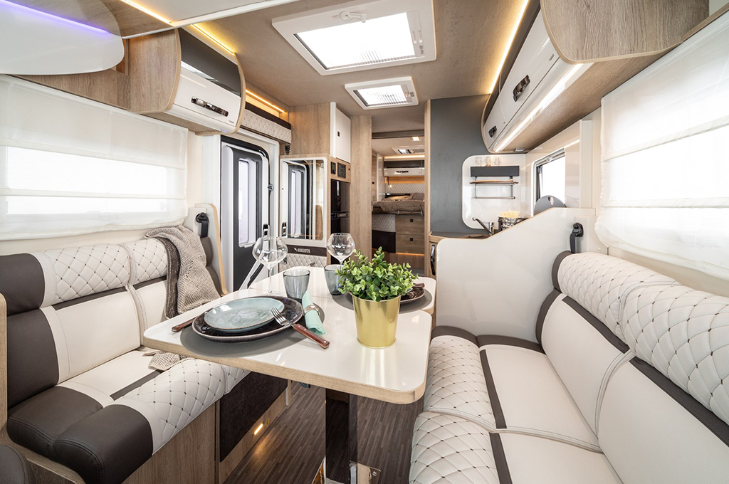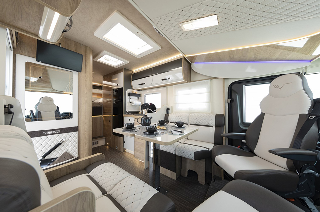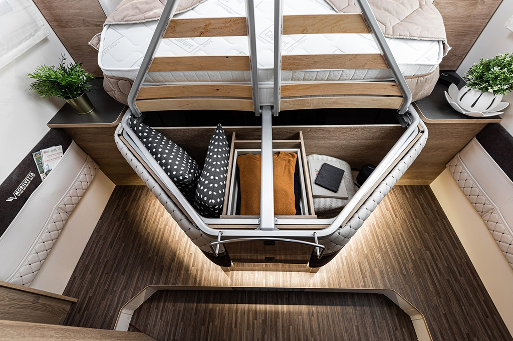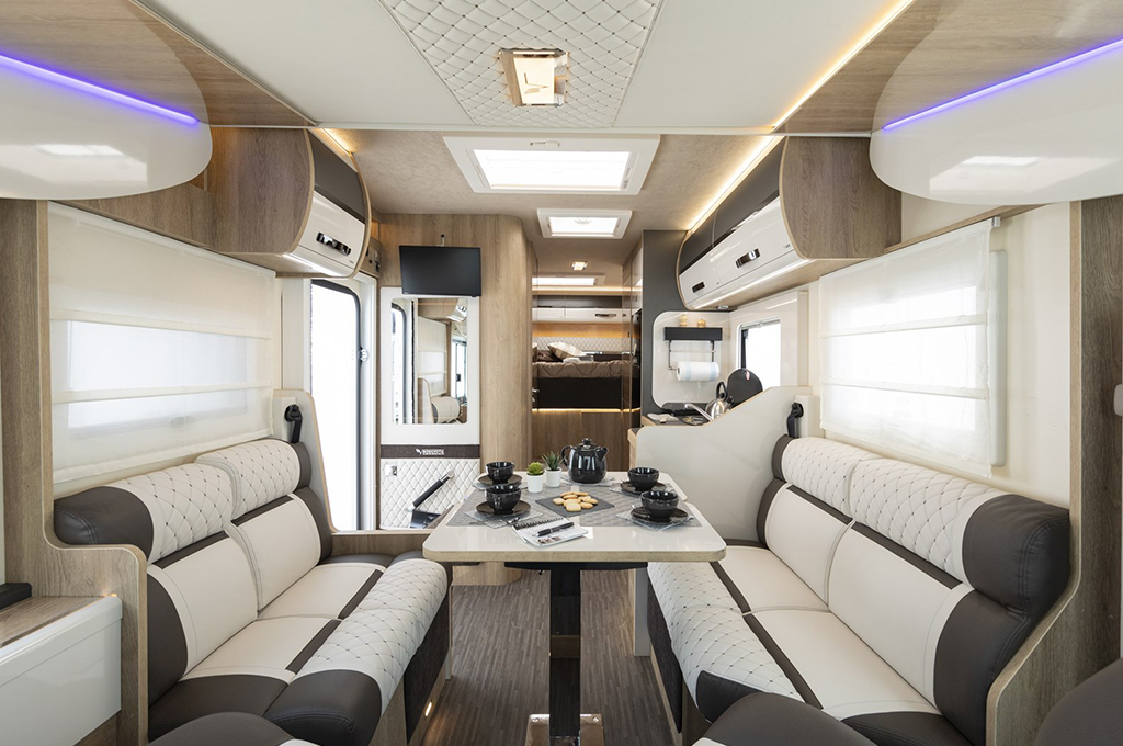 L'illuminazione a LED crea ambienti unici, con sorgenti luminose indirette che aggiungono un tocco scenografico. La presenza di prese USB e un braccio TV estensibile rendono l'ambiente confortevole e tecnologicamente avanzato. Infine, una botola a pavimento offre ulteriore spazio di stivaggio, rendendo ogni viaggio un'esperienza di lusso e comfort.