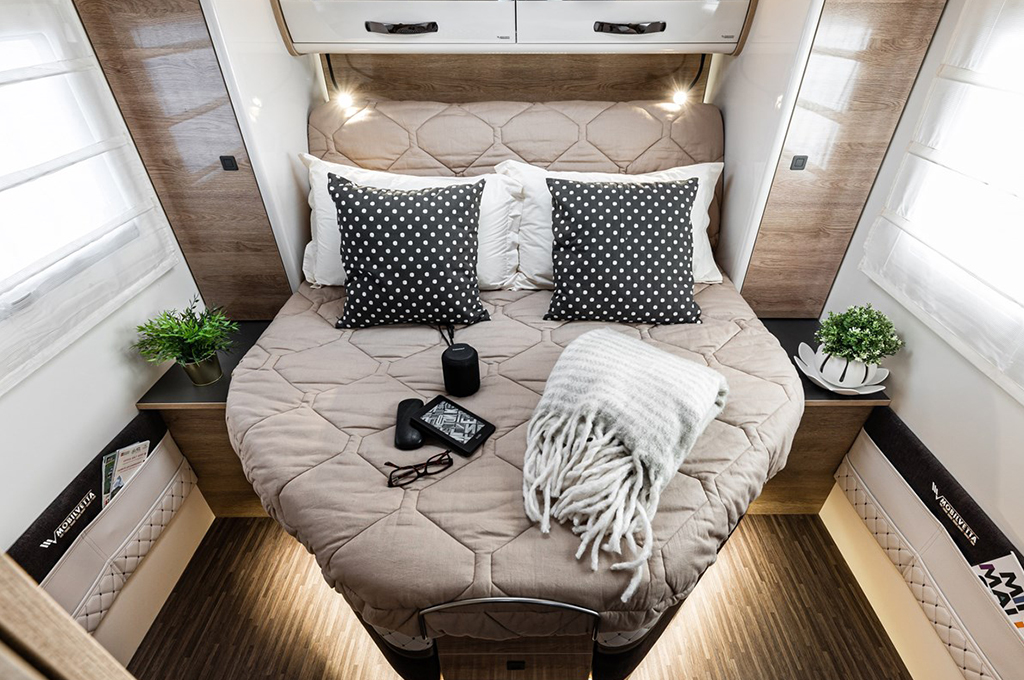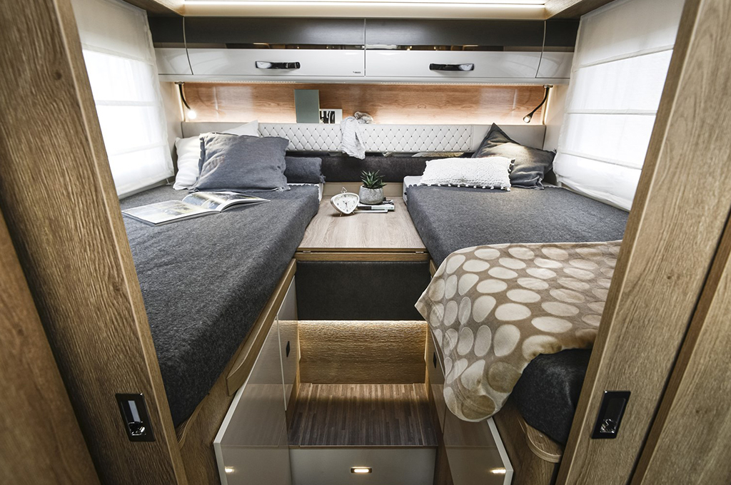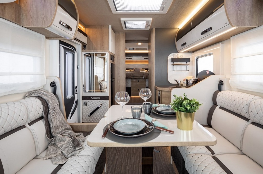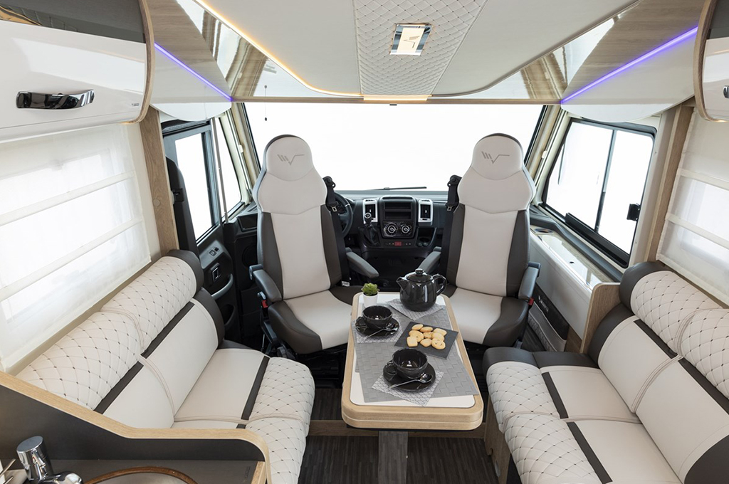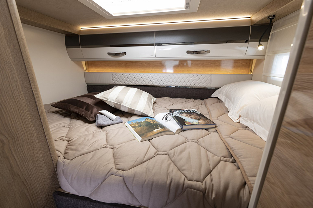 L'illuminazione a LED crea ambienti unici, con sorgenti luminose indirette che aggiungono un tocco scenografico. La presenza di prese USB e un braccio TV estensibile rendono l'ambiente confortevole e tecnologicamente avanzato. Infine, una botola a pavimento offre ulteriore spazio di stivaggio, rendendo ogni viaggio un'esperienza di lusso e comfort.