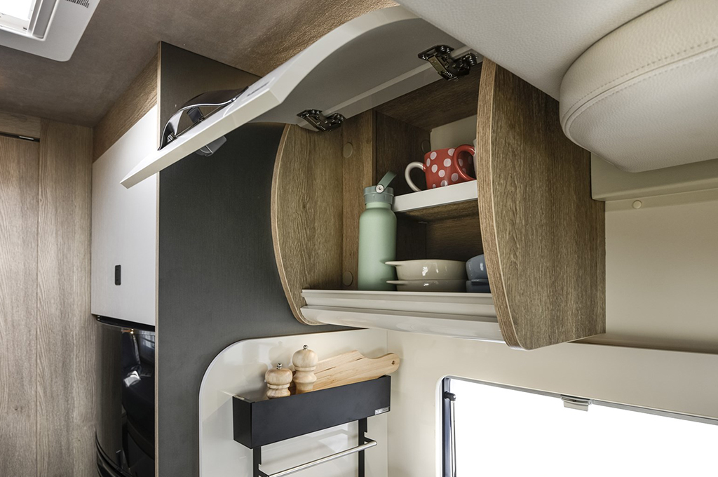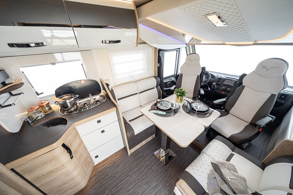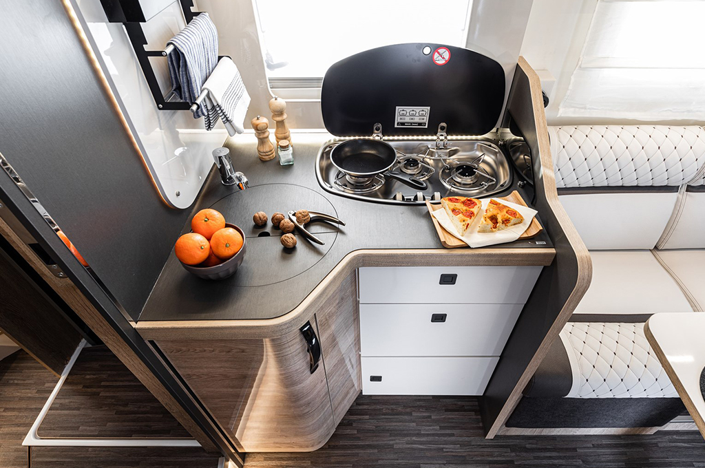 All'interno, l'eleganza prende forma in spazi personalizzabili e luminosi. Il grande soggiorno face to face, trasformabile in viaggio, offre un'altezza superiore ai due metri e un'abbondante luminosità naturale grazie alle ampie finestre. La cucina a "L" è ergonomica e funzionale, con un piano in laminato antigraffio, fornello a tre fuochi e lavello in acciaio inox. I cassetti scorrevoli e i grandi cestoni assicurano spazio di stivaggio ottimale.