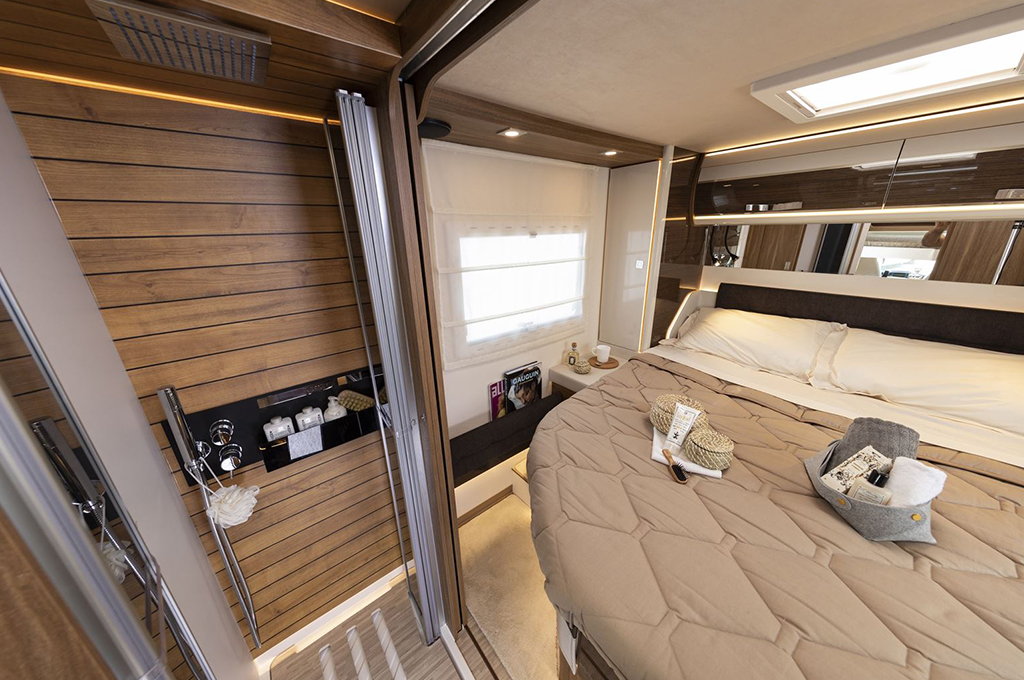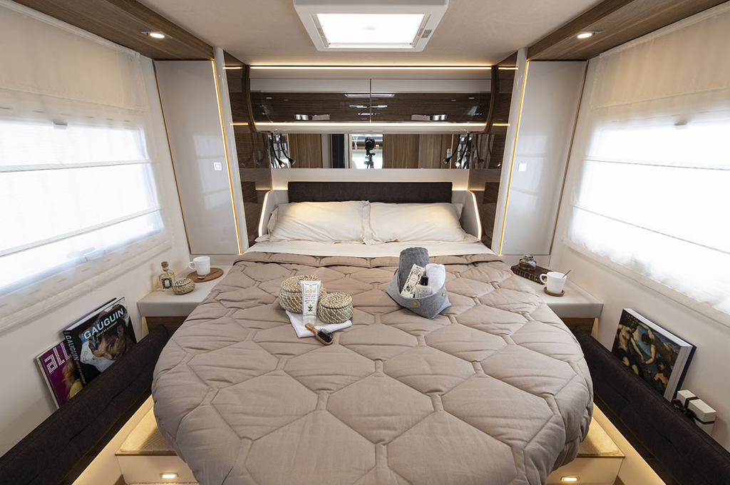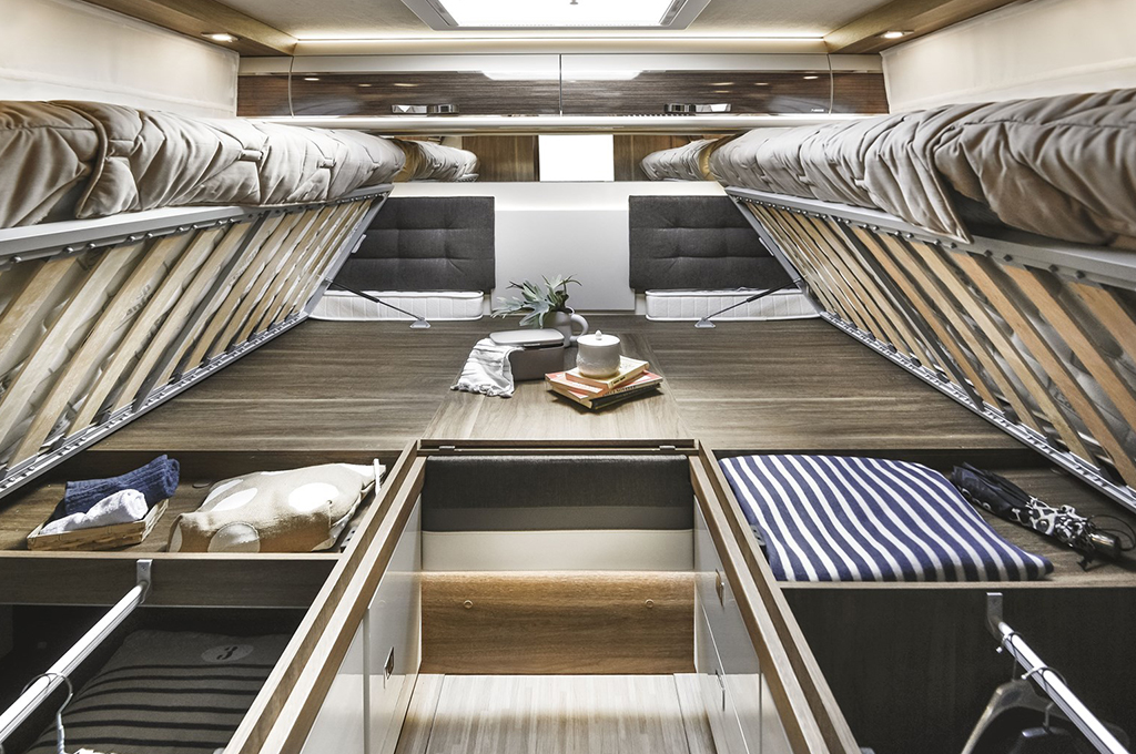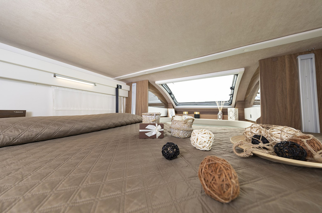 L’abitabilità a bordo è esaltata da soluzioni innovative che rendono ogni ambiente accogliente e funzionale. La zona giorno, spaziosa e luminosa grazie all’oblò panoramico, offre un’altezza interna superiore ai due metri e sedili cabina rotabili per creare un salotto capace di ospitare fino a sei persone. Il design, curato nei minimi dettagli, si combina con materiali pregiati, come il rivestimento imbottito del tetto in soft touch, che isola dall’esterno, e i materassi ergonomici con reti a doghe che garantiscono un sonno confortevole.