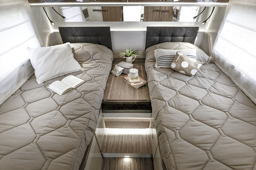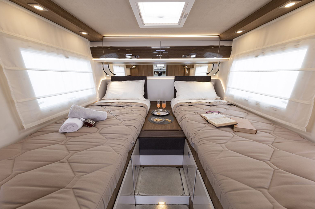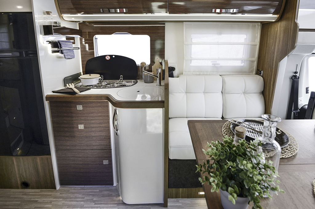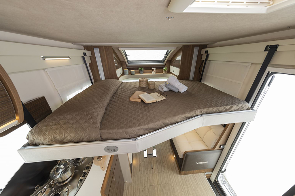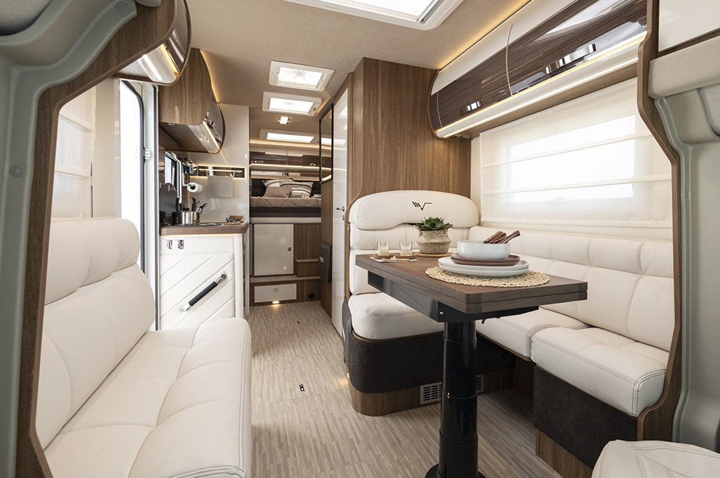 L’abitabilità a bordo è esaltata da soluzioni innovative che rendono ogni ambiente accogliente e funzionale. La zona giorno, spaziosa e luminosa grazie all’oblò panoramico, offre un’altezza interna superiore ai due metri e sedili cabina rotabili per creare un salotto capace di ospitare fino a sei persone. Il design, curato nei minimi dettagli, si combina con materiali pregiati, come il rivestimento imbottito del tetto in soft touch, che isola dall’esterno, e i materassi ergonomici con reti a doghe che garantiscono un sonno confortevole.