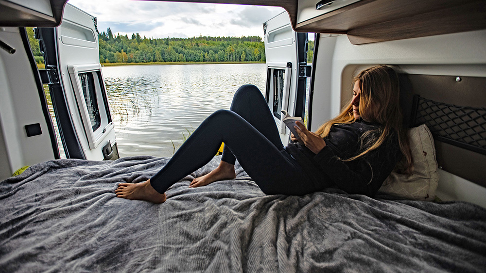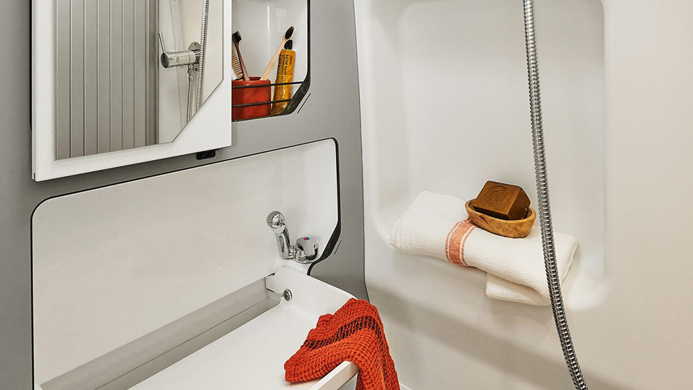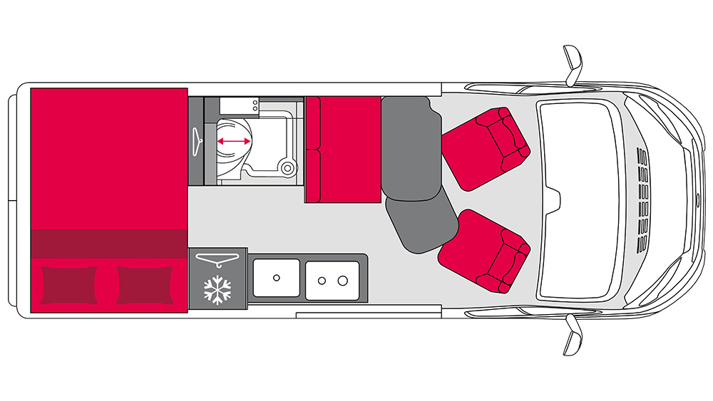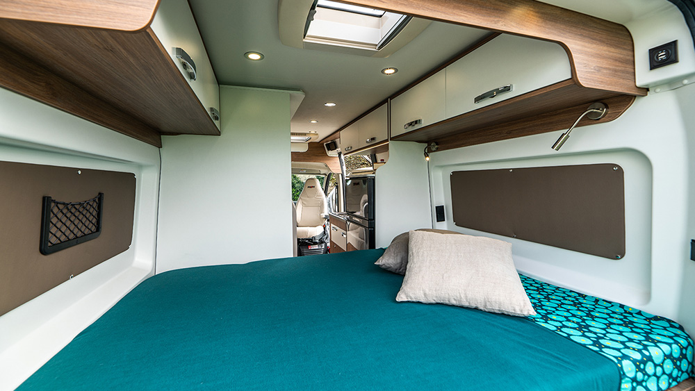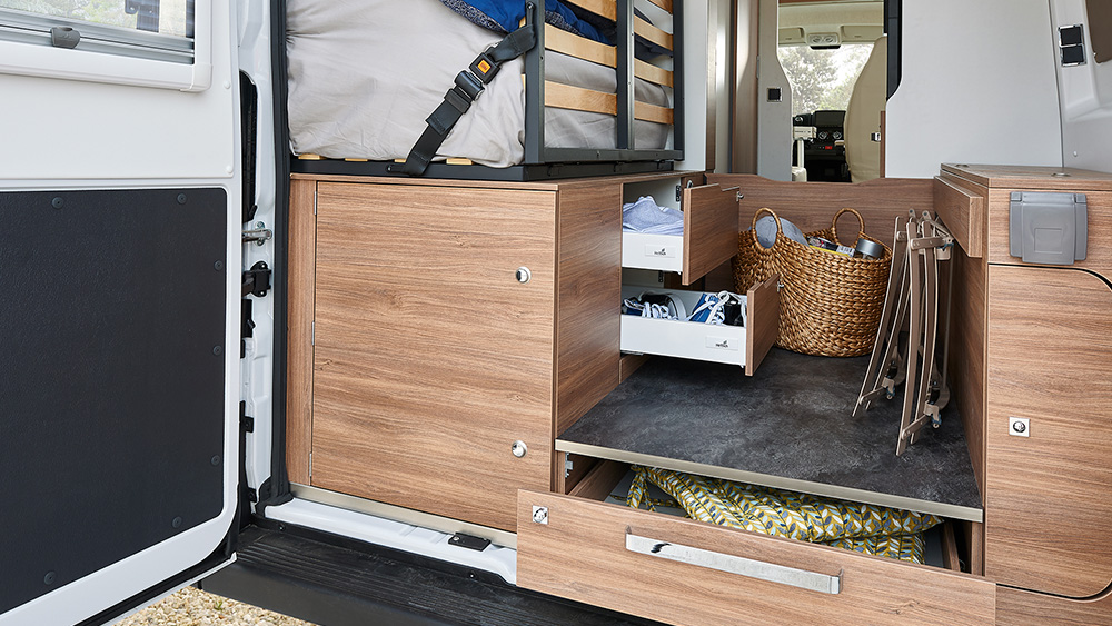 Il letto garage del V600G, con materasso comfort e rete a doghe, misura 135 x 194 cm ed è pensato per offrire un riposo riparatore. Numerosi armadietti sopraelevati con porte USB e un ampio vano portaoggetti sotto il letto assicurano spazio sufficiente per riporre tutti gli oggetti essenziali. Il bagno doccia 3in1, con toilette Thetford a scorrimento e lavabo a scomparsa, offre uno spazio doccia confortevole e ben ventilato grazie al lucernario di 28x28 cm.