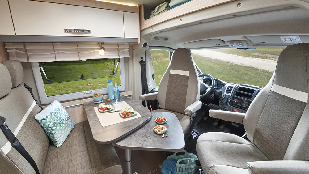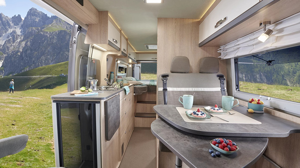 PÖSSL Summit 640 è un camper versatile che si distingue per il suo ampio concetto dello spazio, progettato per offrire un'esperienza di viaggio confortevole e funzionale. Con una lunghezza di circa 6.358 mm, una larghezza di 2.050 mm e un'altezza di 2.580 mm, questo veicolo presenta dimensioni generose, perfette per ospitare comodamente fino a quattro persone. L'altezza interna di 1.905 mm del PÖSSL Summit 640 contribuisce a creare un ambiente spazioso e arioso, ideale per la vita in movimento.