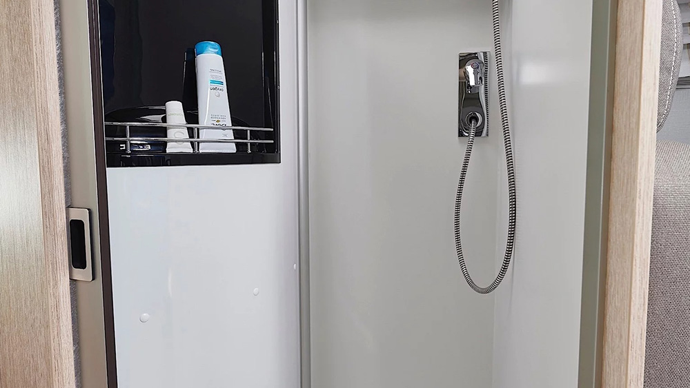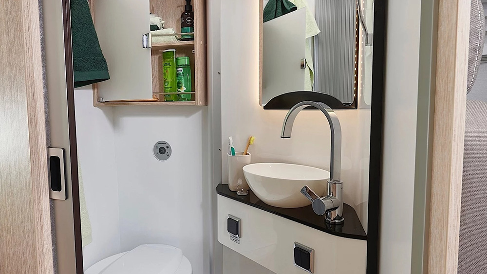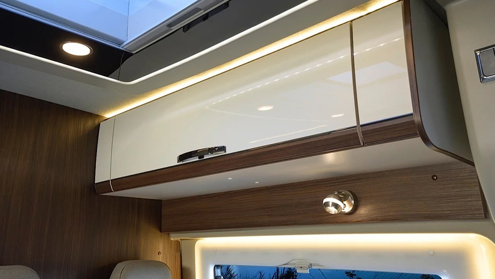Le finestre a filo di alta qualità conferiscono al PÖSSL Summit 640 un aspetto automobilistico, garantendo allo stesso tempo un'ottima luminosità naturale all'interno. Il peso complessivo del veicolo è di 3.500 kg, con una massa in marcia di circa 2.960 kg e un carico utile di 540 kg, rendendolo robusto e sicuro per lunghi viaggi. Il modello è equipaggiato con un sistema di riscaldamento Truma Combi 4 e un boiler da 10 litri, insieme a un serbatoio dell'acqua potabile da 100 litri e uno per le acque grigie da 110 litri, assicurando autonomia e comfort durante il soggiorno.