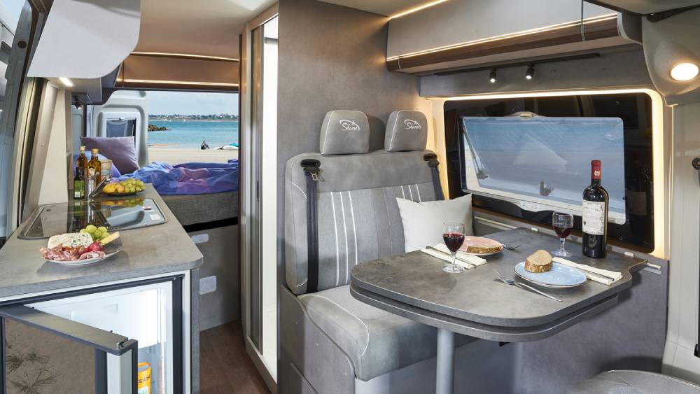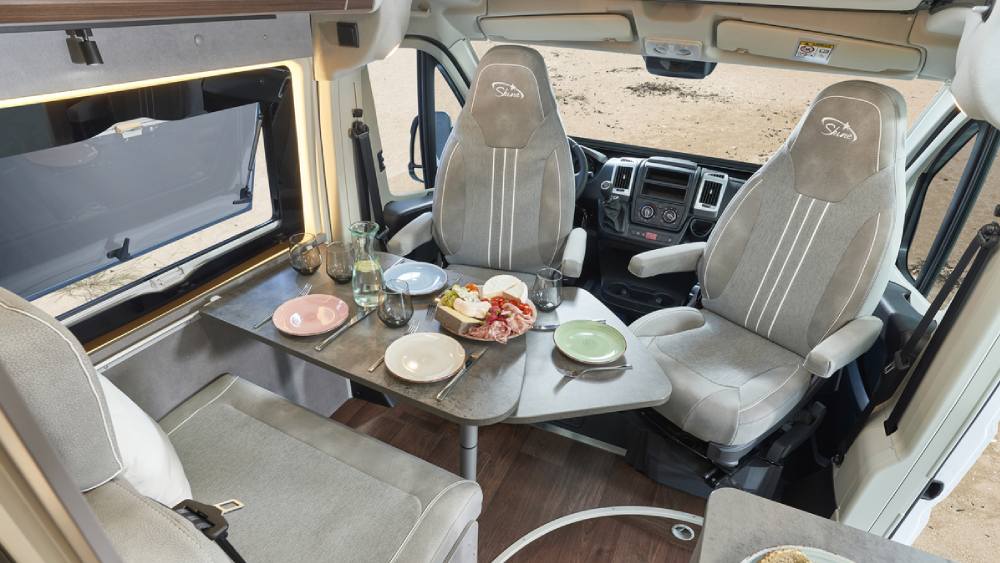 Il design interno presenta un decoro in legno mokka e una tappezzeria grigio lucente che conferiscono al camper un'atmosfera accogliente e moderna. Il tavolo confortevole con parte estraibile offre uno spazio ideale per cenare o lavorare durante il viaggio.
