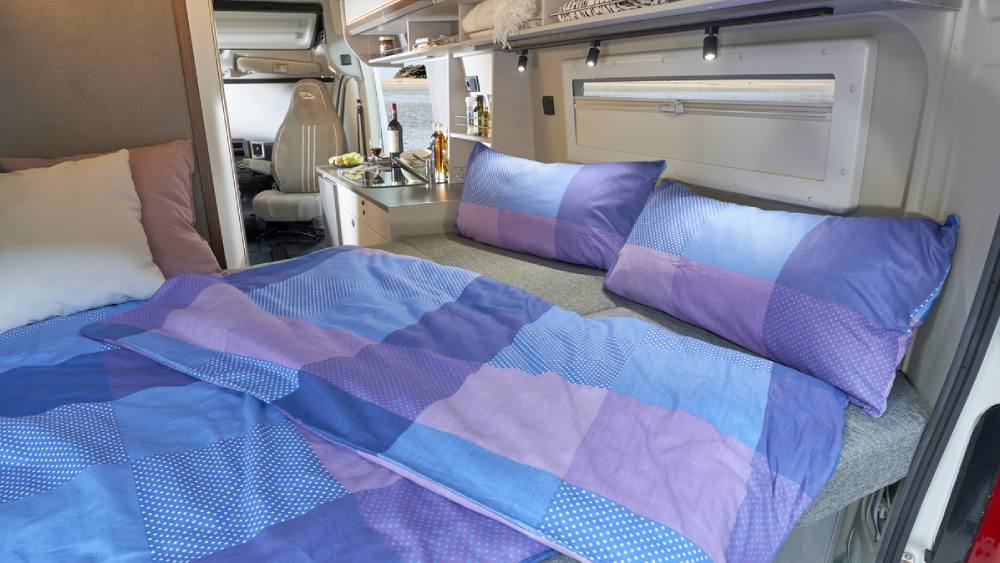 Nella zona giorno, le finestrature in plastica isolante assicurano un ambiente confortevole in qualsiasi condizione climatica, mentre gli oblò Midi Heki offrono luce naturale e ventilazione. Con posti viaggio e cinture di sicurezza a tre punti per 3 o 4 persone (più 1 optional), e un comodo letto matrimoniale trasversale, questo camper offre una sistemazione accogliente per la notte.