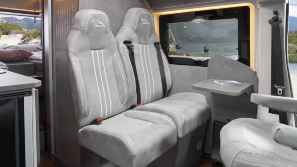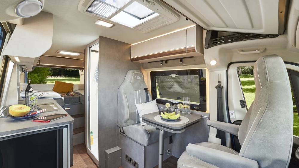 La zona giorno è dotata di cinque finestre in plastica isolante con oscuranti e zanzariere, due oblò Midi Heki con oscurante e zanzariera, e offre tre posti viaggio con cinture di sicurezza a tre punti, espandibili a quattro. Per il pernottamento, ci sono due posti letto con la possibilità di aggiungerne un terzo opzionale, con misure variabili per adattarsi alle esigenze degli occupanti. Inoltre, sono disponibili due attacchi Isofix per i seggiolini dei bambini, rendendo il veicolo adatto anche per le famiglie.