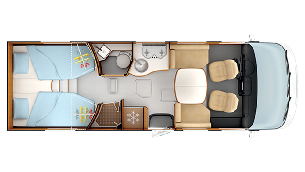 Rapido Distinction i66 è un capolavoro di ingegneria e design, concepito per offrire il massimo comfort e funzionalità. L'ampio salotto aperto con divanetti contrapposti e braccioli garantisce uno spazio accogliente e conviviale, ideale per momenti di relax e socializzazione. La zona notte è dotata di letti gemelli trasformabili in un ampio letto matrimoniale trasversale, adattandosi perfettamente alle esigenze di coppie o amici. Il bagno privato e la doccia indipendente assicurano un'esperienza di massima comodità e privacy.