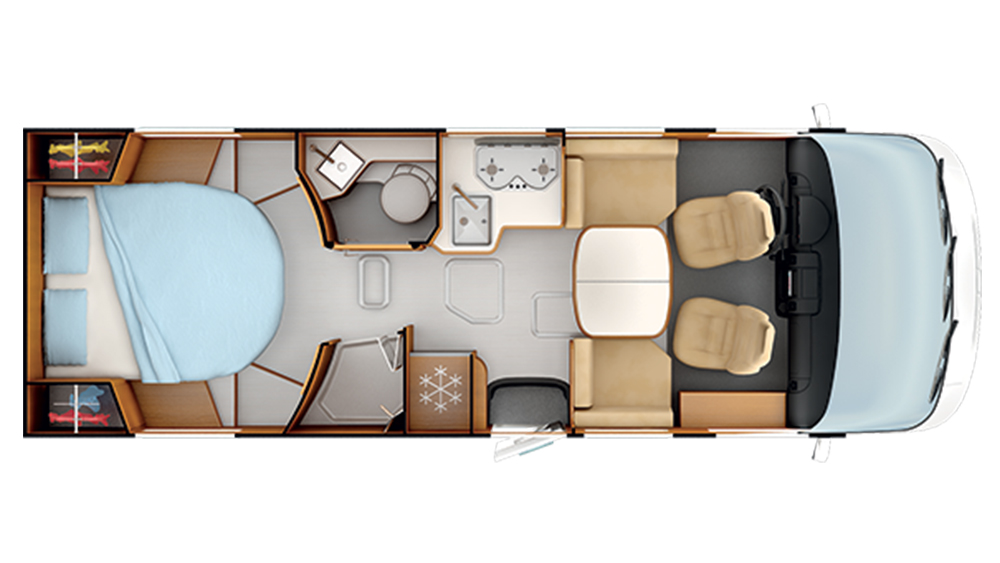 Il design degli interni è pensato per offrire il massimo comfort e funzionalità. Il salotto aperto con divanetti contrapposti e braccioli crea un'atmosfera accogliente e conviviale, ideale per rilassarsi o intrattenere gli ospiti. Il letto centrale XL, regolabile elettricamente in altezza di 30 cm, assicura un riposo rigenerante, mentre le nicchie portaoggetti retroilluminate offrono spazio per riporre gli oggetti personali in modo ordinato.