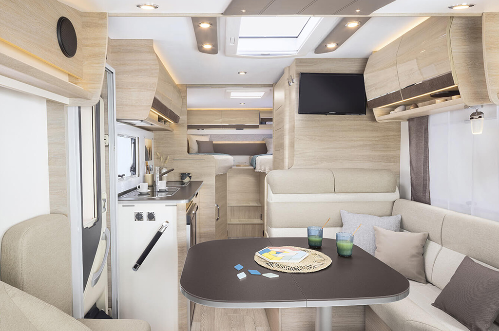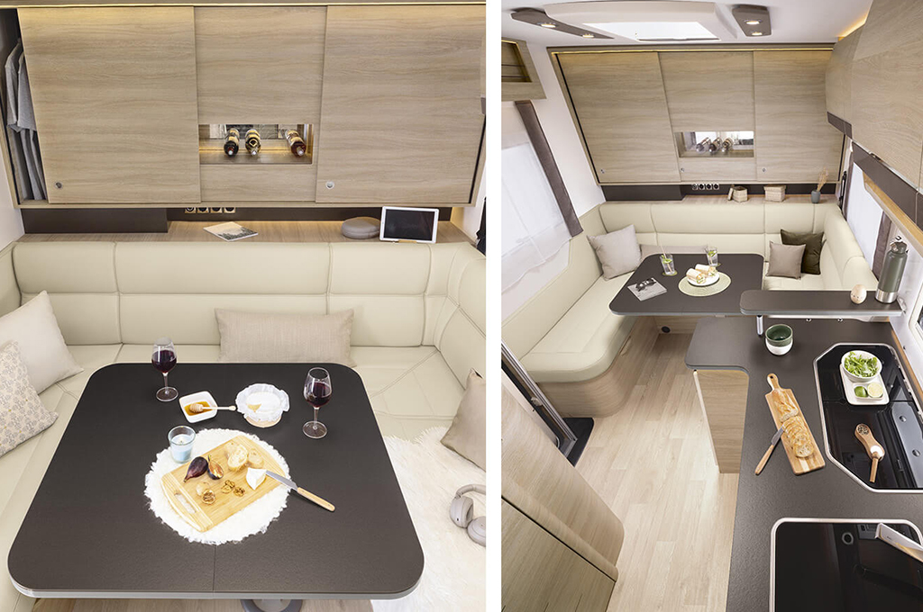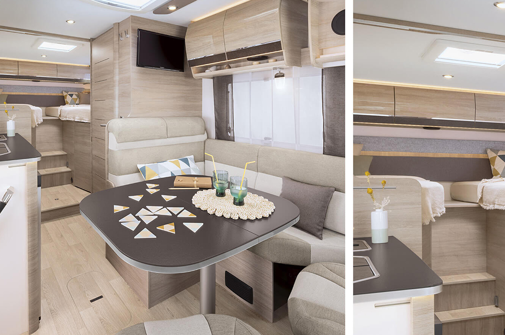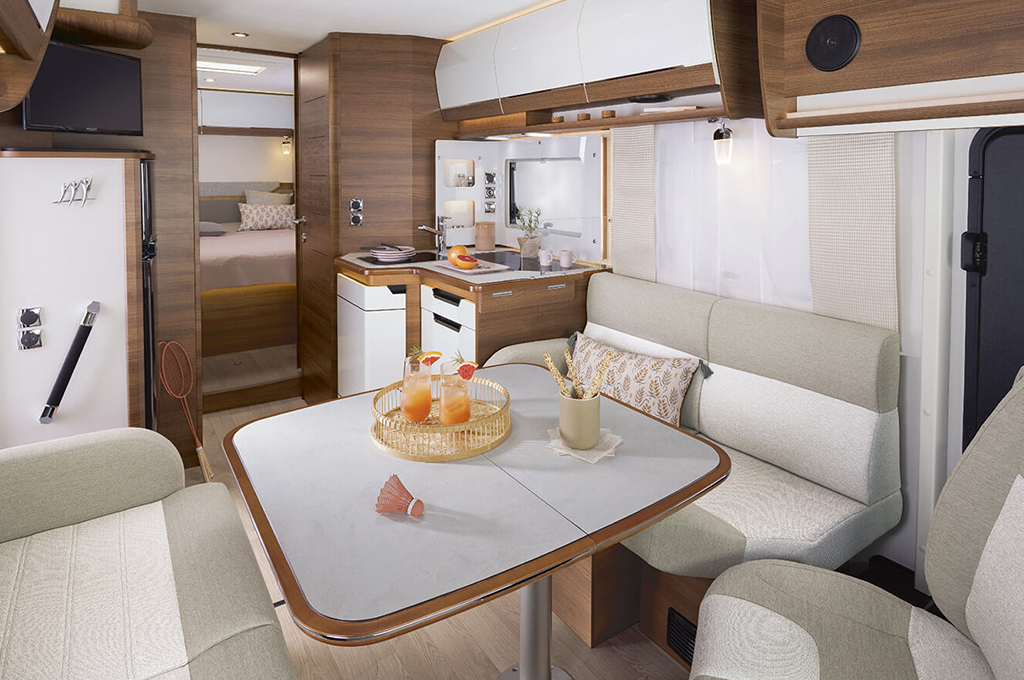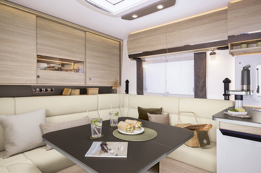 Il tavolo a portafoglio facilita la convivialità durante i pasti e le riunioni, mentre lo spazio di stivaggio aggiuntivo nel vano del divanetto del salotto destro assicura un'organizzazione ottimale degli effetti personali. Il salotto convertibile in un letto supplementare da 2 piazze offre un riposo rigenerante durante i lunghi viaggi.