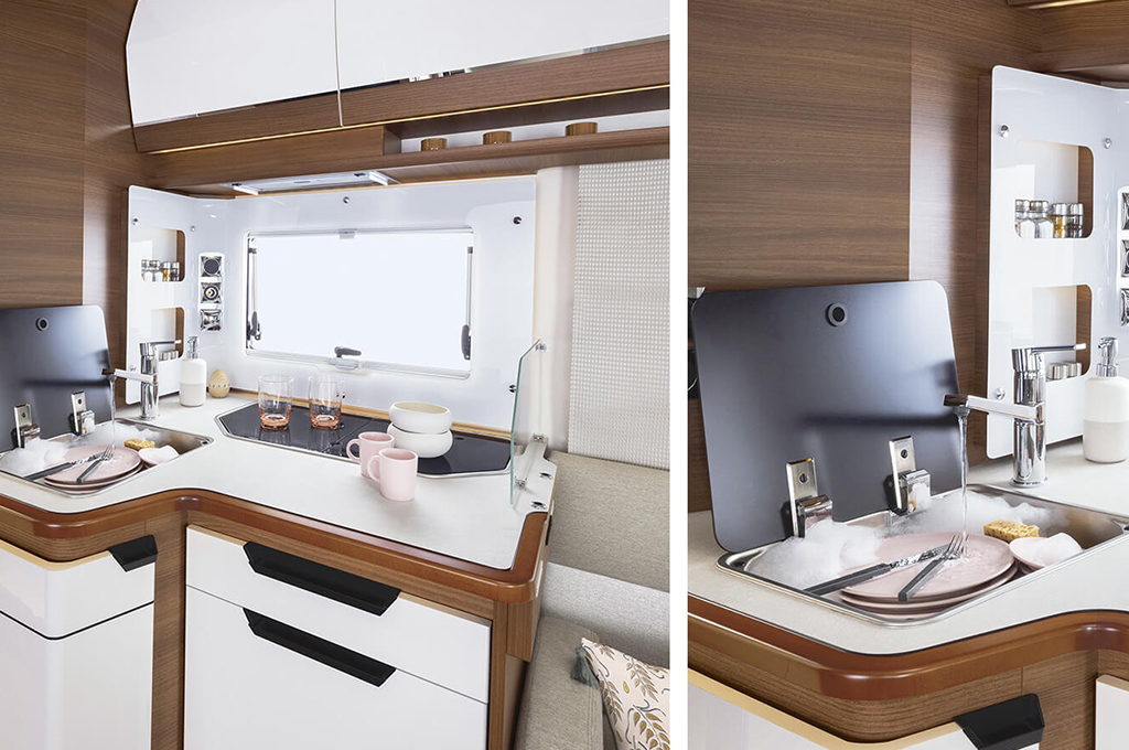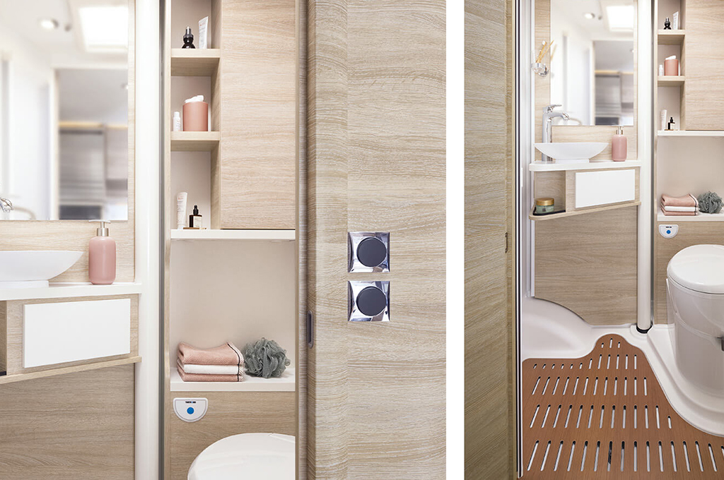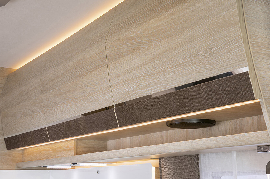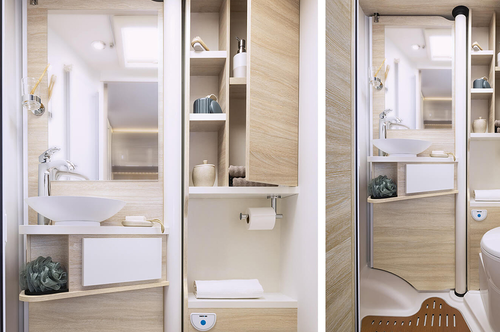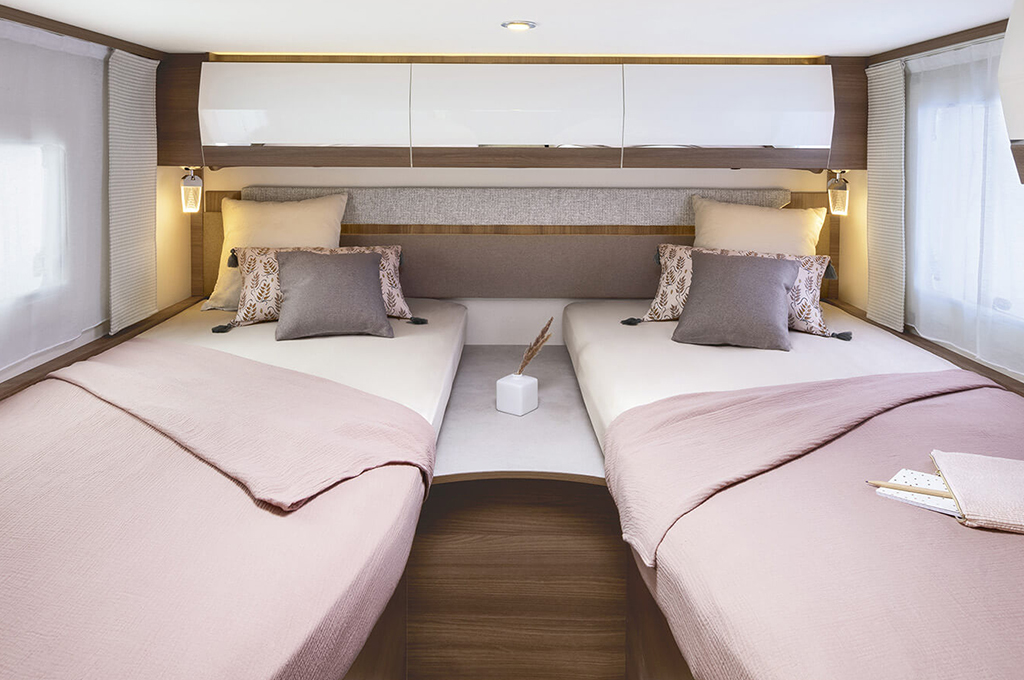 Il tavolo a portafoglio facilita la convivialità durante i pasti e le riunioni, mentre lo spazio di stivaggio aggiuntivo nel vano del divanetto del salotto destro assicura un'organizzazione ottimale degli effetti personali. Il salotto convertibile in un letto supplementare da 2 piazze offre un riposo rigenerante durante i lunghi viaggi.