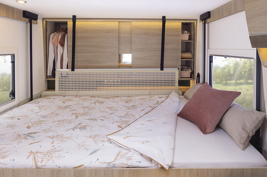 Il guardaroba posteriore XXL è dotato di ante scorrevoli, mensole e appendiabiti a tutta altezza per un accesso facile e pratico ai vestiti e agli accessori. Le grandi finestre laterali garantiscono una luminosità eccezionale all'interno dell'abitacolo.