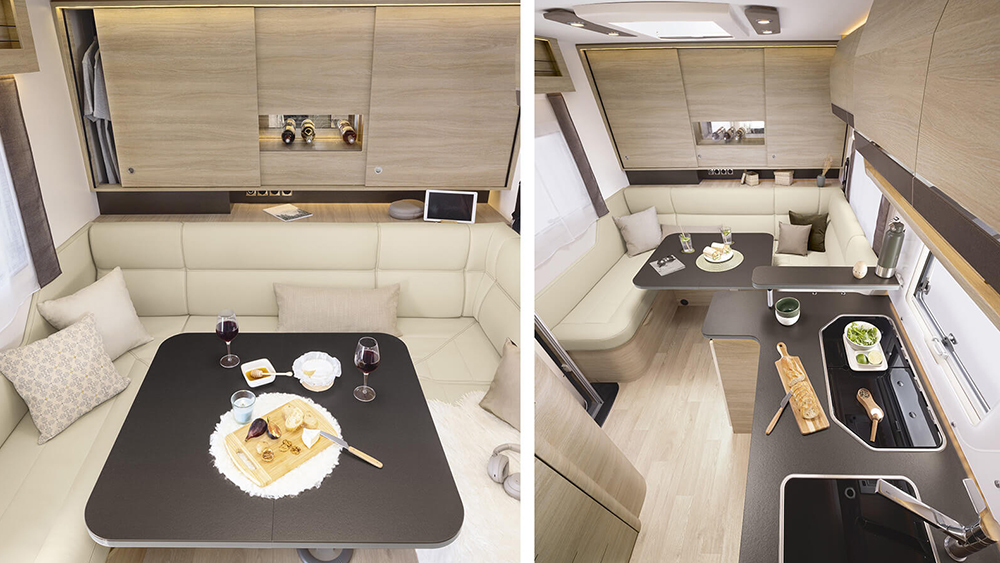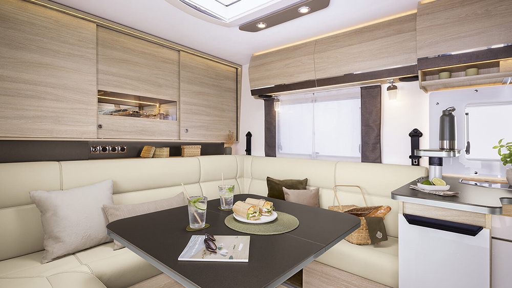 Il grande salotto posteriore può ospitare fino a 7 persone, offrendo un'atmosfera accogliente e conviviale. Il tavolo a portafoglio e lo spazio di stivaggio aggiuntivo nel vano del divanetto del salotto consentono di organizzare gli spazi in modo efficiente. Inoltre, il salotto è convertibile in un letto supplementare da 2 piazze, garantendo il massimo comfort durante la notte.