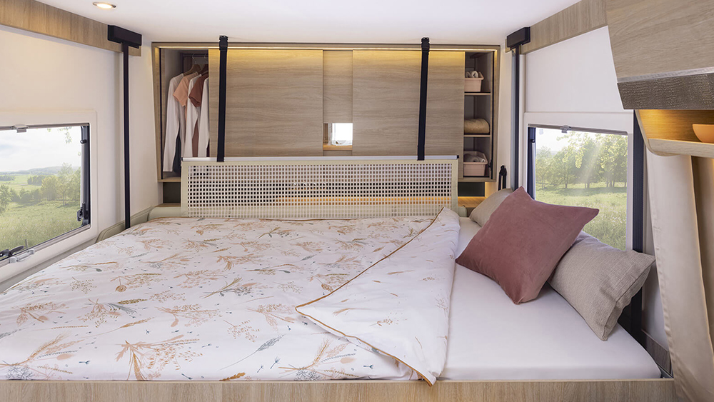 Il guardaroba posteriore XXL offre un ampio spazio di stivaggio per vestiti e altri oggetti personali, con ante scorrevoli, mensole e appendiabiti a tutta altezza per un accesso facile e conveniente. Le grandi finestre laterali massimizzano la luminosità interna, creando un'atmosfera luminosa e ariosa.