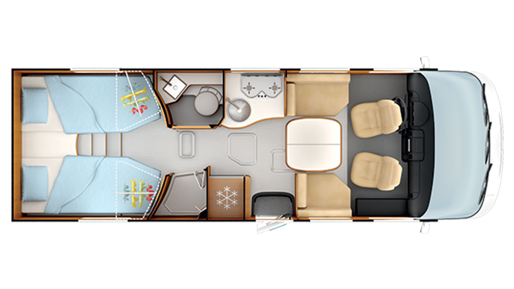All'interno, il salotto accogliente è il cuore pulsante del veicolo, con divanetti contrapposti e braccioli che creano un'atmosfera conviviale. I letti gemelli trasformabili in un letto matrimoniale trasversale offrono comfort durante la notte, mentre il guardaroba ai piedi dei letti assicura uno spazio per riporre comodamente gli effetti personali.