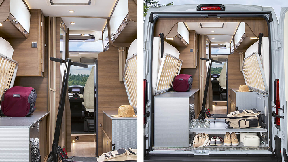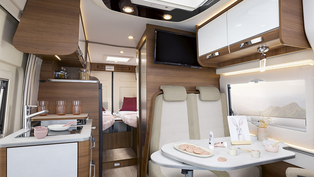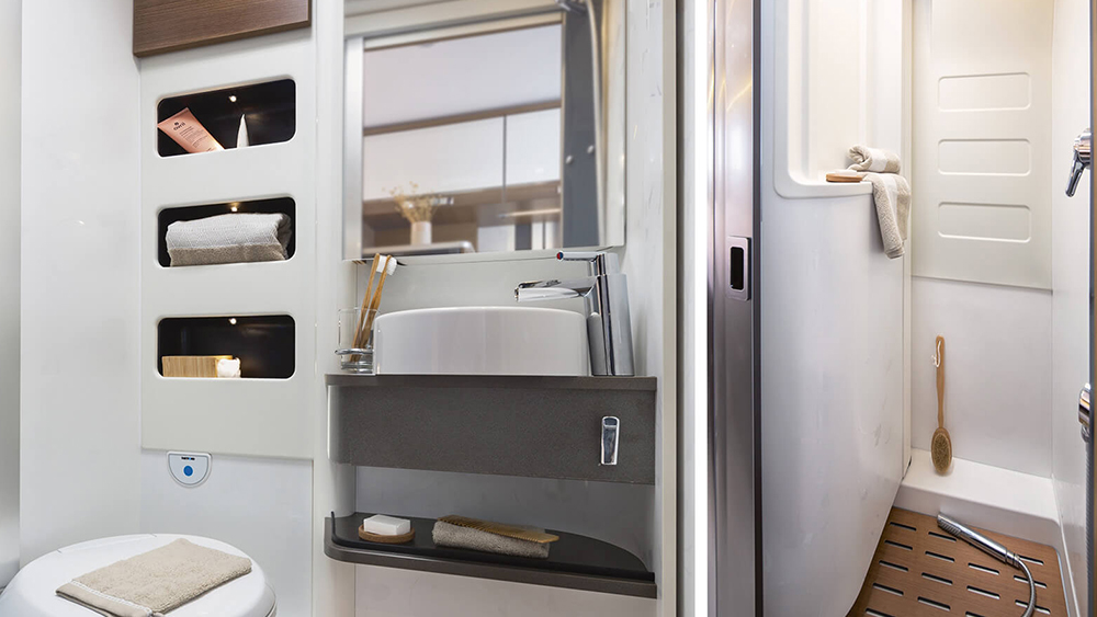La cucina è dotata di un grande frigorifero a compressione da 146 litri e un pratico cestino portabottiglie, ideale per conservare alimenti e bevande durante i viaggi. Il bagno DUO'SPACE presenta una parete girevole per ottimizzare gli spazi, insieme a un'ampia gamma di comfort, tra cui una doccia, un WC con cassetta estraibile e un pratico porta asciugamani.