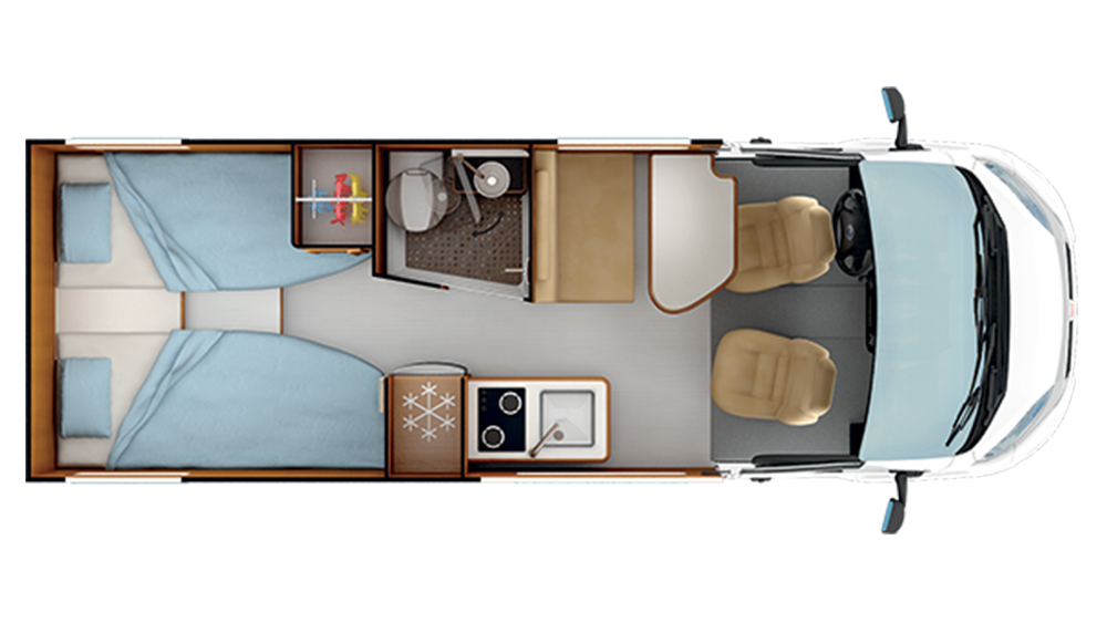 All'interno, il Van V68 si trasforma in un accogliente rifugio con 3 posti notte, includendo letti gemelli trasformabili in un comodo letto matrimoniale trasversale. Il grande salone offre spazio sufficiente per ospitare comodamente 4 persone, mentre la tenda separatoria crea una divisione discreta tra lo spazio giorno e notte.