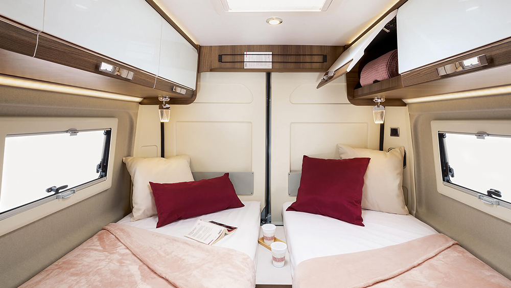 La camera da letto è un'oasi di tranquillità, con un letto fisso dotato di rete in alluminio e materasso in schiuma ad alta resilienza. Gli altoparlanti integrati consentono di godere della propria musica preferita anche durante il riposo.