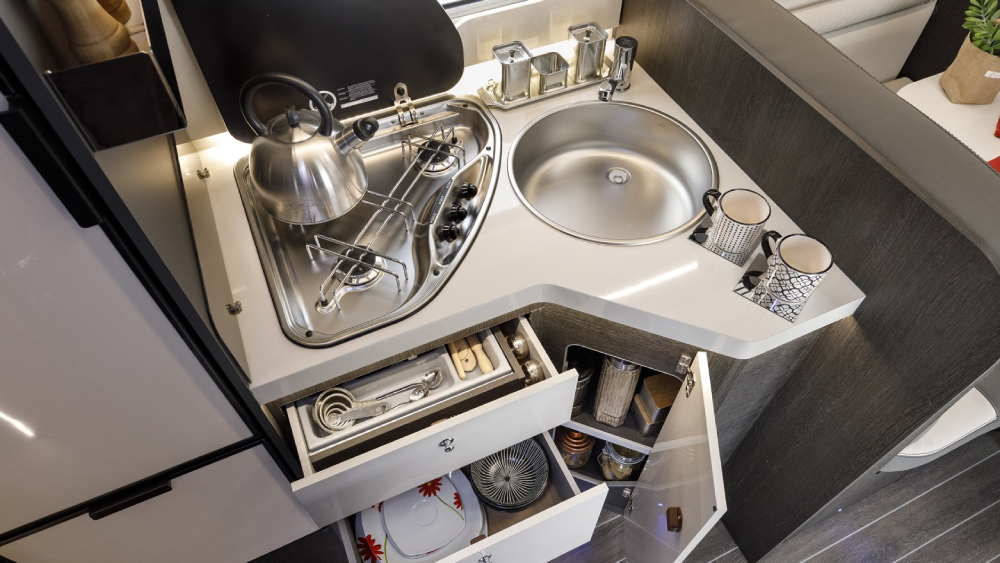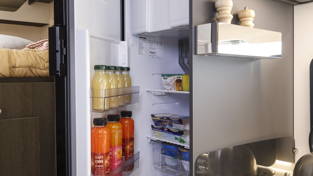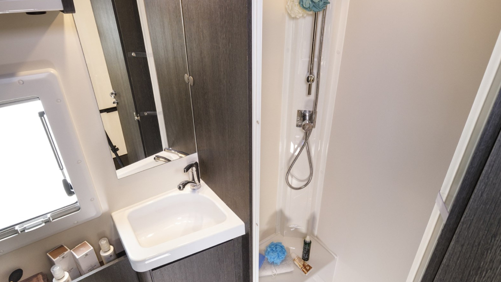L'equipaggiamento comprende anche una cucina completa con fuochi a gas, frigorifero trivalente automatico da 135 litri e un piatto doccia con doppio scarico. Il riscaldamento è garantito dal Truma Combi 4 Gas, assicurando comfort anche durante le giornate più fredde.