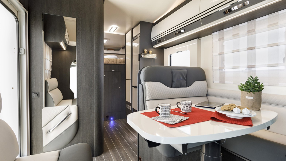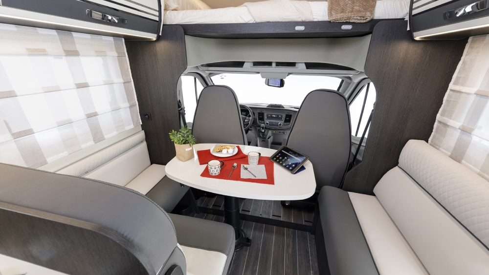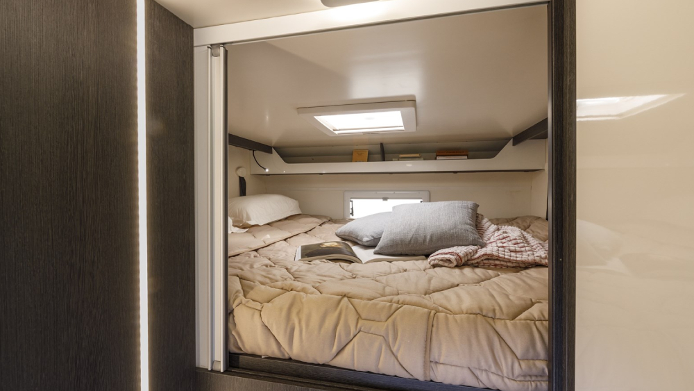 L'interno è ben progettato e confortevole, con posti letto multifunzionali che includono un letto supplementare dalla dinette trasformabile, un letto posteriore ampio di dimensioni 215x183 cm, un letto mansarda di 209x160 cm e un letto supplementare ausiliario in dinette di 212x113 cm (50). Ci sono anche ampi spazi di archiviazione, inclusi gavoni con apertura utile di 130x135 cm.