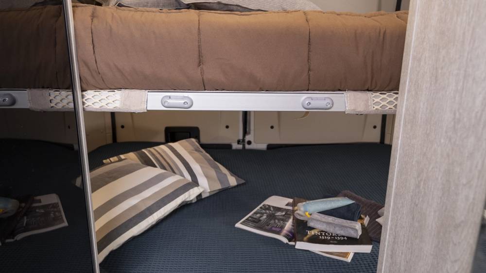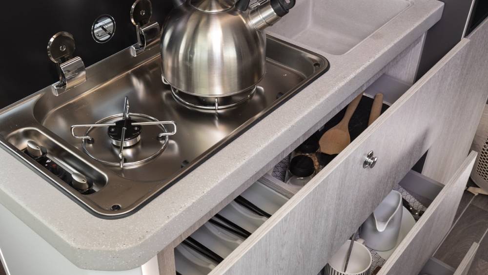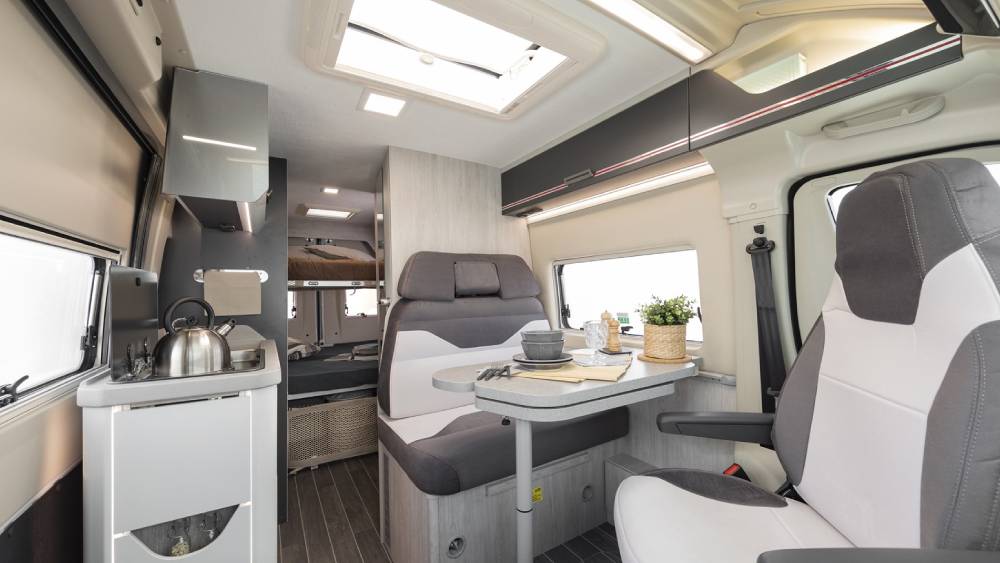 L'efficienza logistica è un punto di forza, con una capacità massima dei serbatoi di acqua chiara e grigia (90 litri e 20 litri rispettivamente), garantendo autonomia anche nei luoghi più remoti. Il riscaldamento standard COMBI 4KW DIESEL assicura il comfort anche nelle notti più fresche, mentre il frigorifero a compressore da 84 litri mantiene gli alimenti freschi durante i lunghi viaggi.
