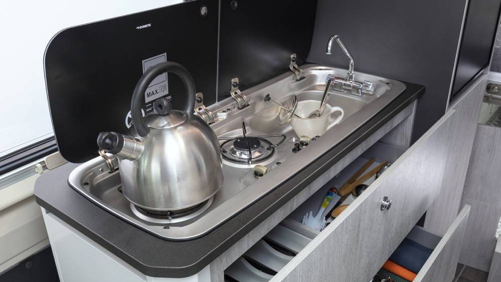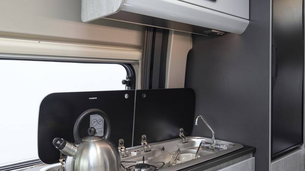 L'impiantistica è progettata per garantire comfort e autonomia. Il frigorifero a compressore offre una capacità generosa di 84 litri, mentre il riscaldamento standard Webasto Air Top 40 assicura un clima piacevole anche nelle fredde notti invernali. Con serbatoi per acque chiare e grigie da 90 e 20 litri rispettivamente, oltre a un frigorifero trivalente, si può viaggiare in completa autonomia.
