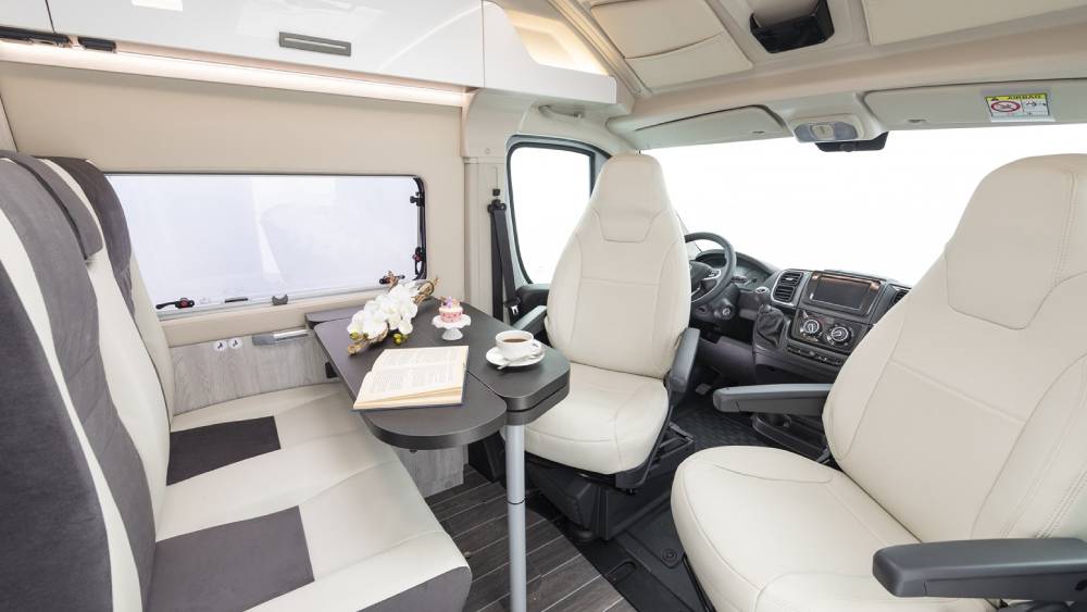 L'interno è curato nei minimi dettagli, con oscuranti plissettati per la cabina, moquette nella cabina e nella cellula, e un tavolo dinette estendibile per permettere comode cene in famiglia. All'esterno, una retrocamera facilita le manovre, mentre il gradino elettrico di accesso alla cellula e la zanzariera per il portellone laterale aggiungono praticità e comfort durante il campeggio all'aria aperta.