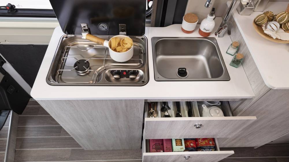 Con una capacità massima dei serbatoi di acqua chiara di 85 litri e di acqua grigia di 20 litri (o 90 litri e 75 litri rispettivamente), il Livingstone 6 offre un'autonomia senza pari per lunghe avventure su strada. I suoi cerchi da 15 pollici (opzionalmente 16 pollici) garantiscono una guida sicura e confortevole su qualsiasi terreno.
