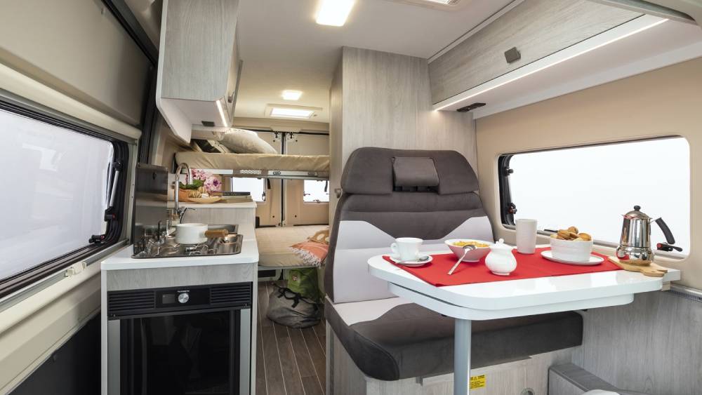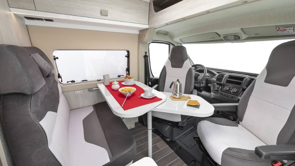 L'abitacolo è progettato per massimizzare il comfort e l'efficienza, con un frigorifero a compressore da 70 litri che mantiene gli alimenti freschi durante tutto il viaggio. Il riscaldamento standard COMBI 4KW GAS assicura una temperatura piacevole anche nelle giornate più fredde, consentendo di viaggiare in qualsiasi stagione dell'anno. Gli oblò, inclusi un oblò standard da 400x400 mm e un ampio oblò panoramico da 700x500 mm, permettono di godere della luce naturale e di ammirare i panorami circostanti.
