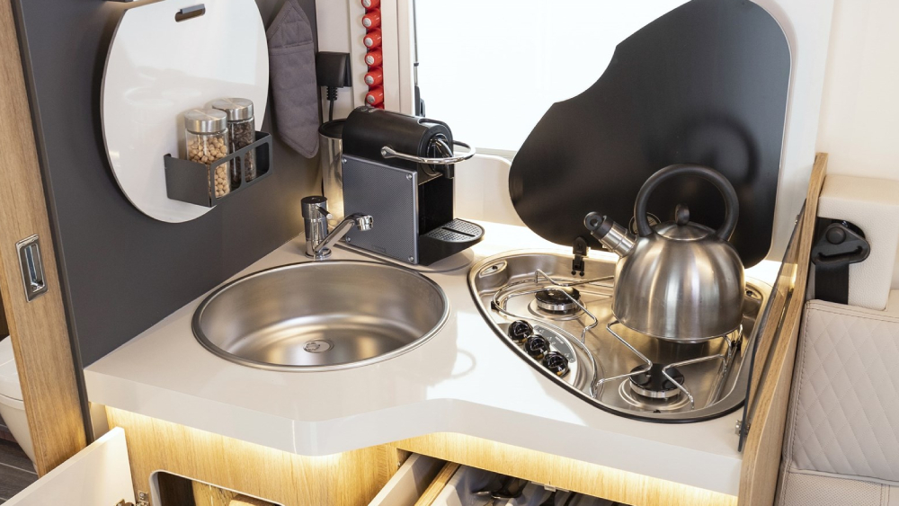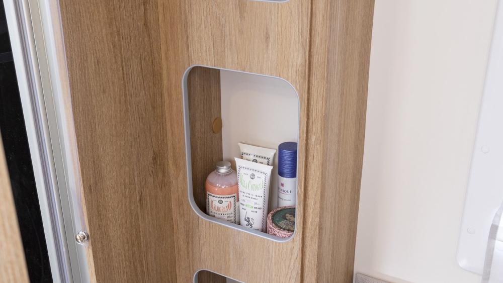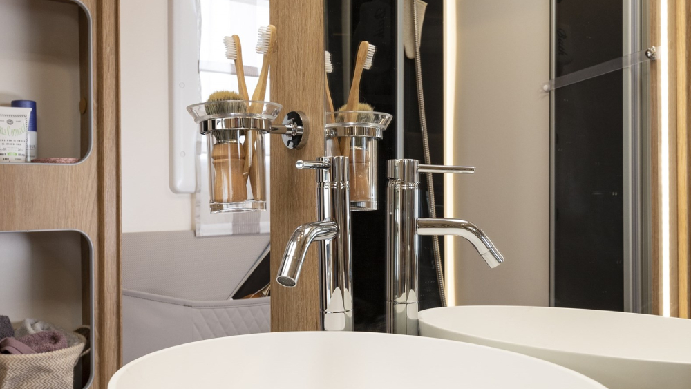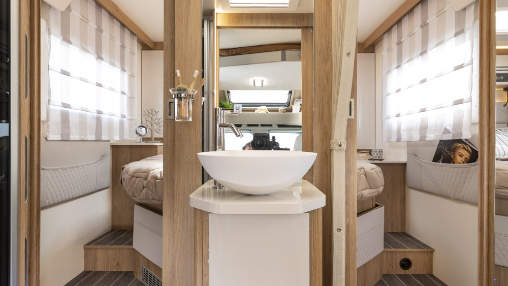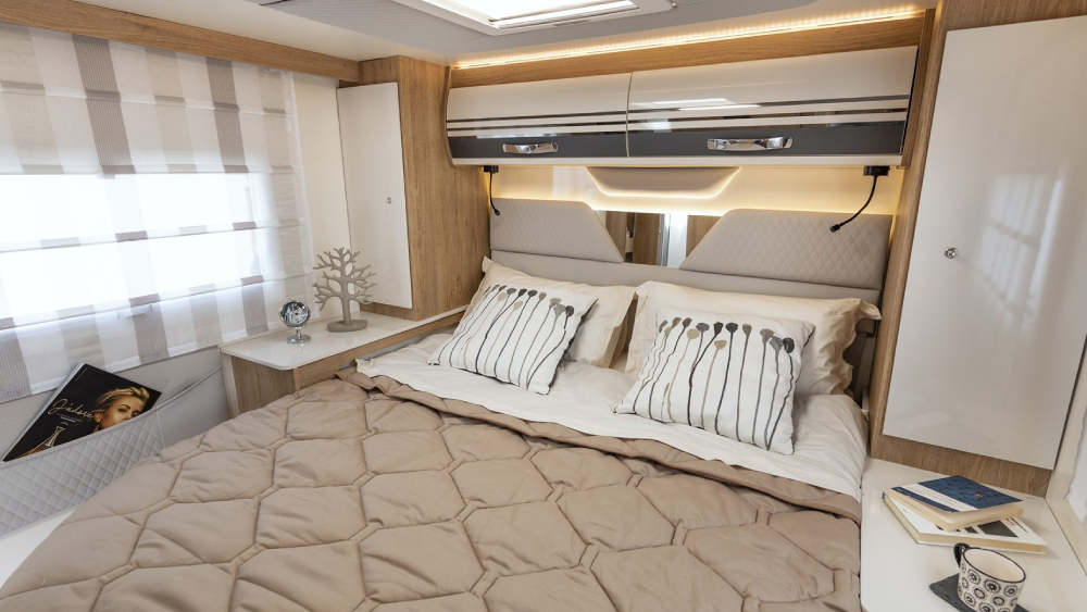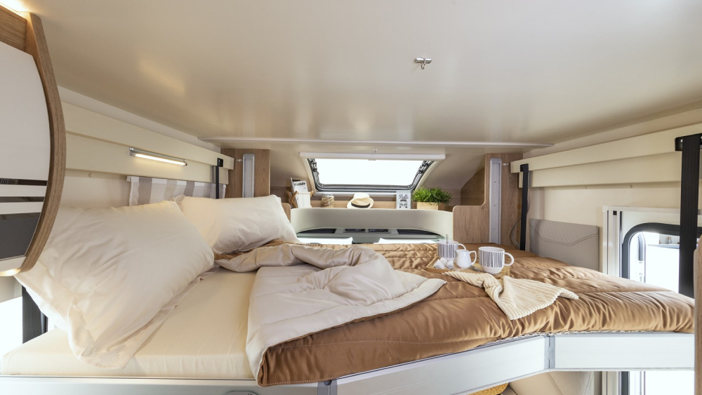 L'attenzione ai dettagli è evidente anche negli interni, con materiali di alta qualità come pavimenti MTS e pareti in VTR, garantendo durata e facilità di manutenzione. Il camper è dotato di un tetto in vetroresina antigrandine e di un isolamento efficace, assicurando comfort termico in ogni stagione.