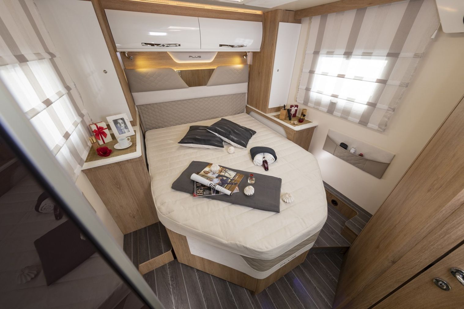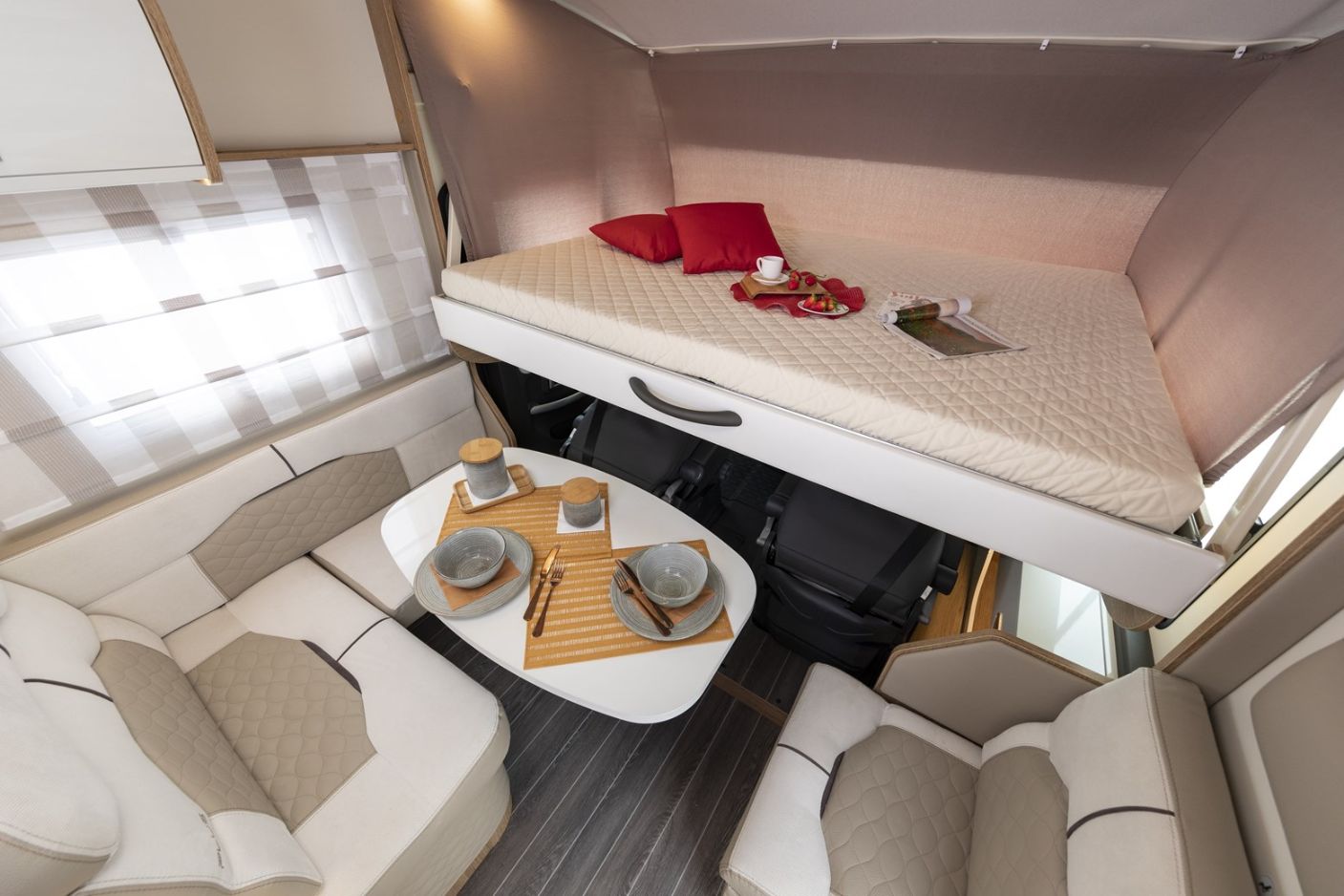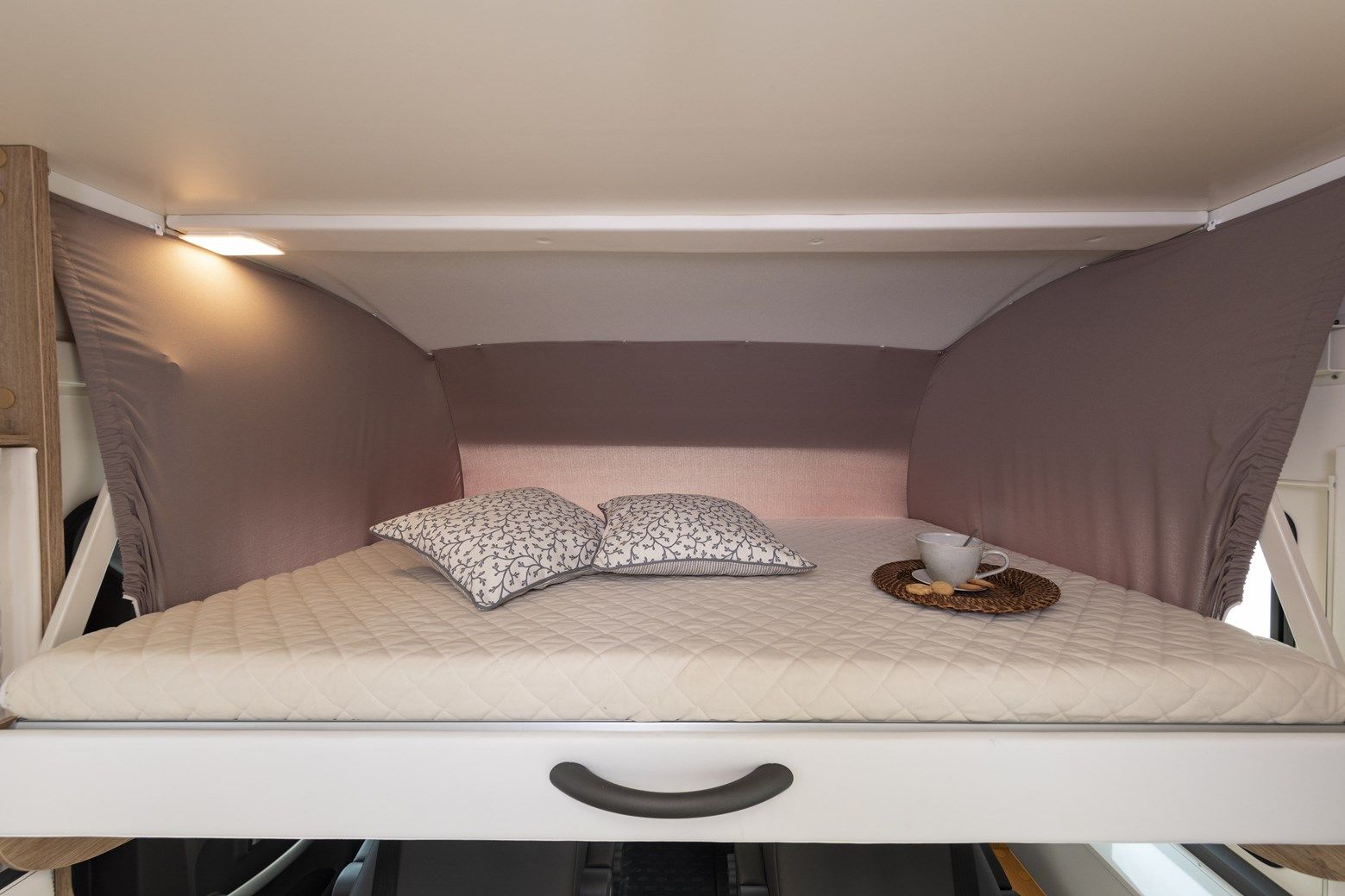 I pensili, installati con uno spazio dalla parete del camper, favoriscono una circolazione dell'aria ottimale, mentre pannelli anticondensa e reti a doghe su tutti i letti garantiscono una ventilazione costante. Anche il design dei materassi è stato attentamente studiato, con una parte inferiore in tessuto tecnico traspirante e una superiore in poliestere trapuntato per il massimo comfort durante il riposo.