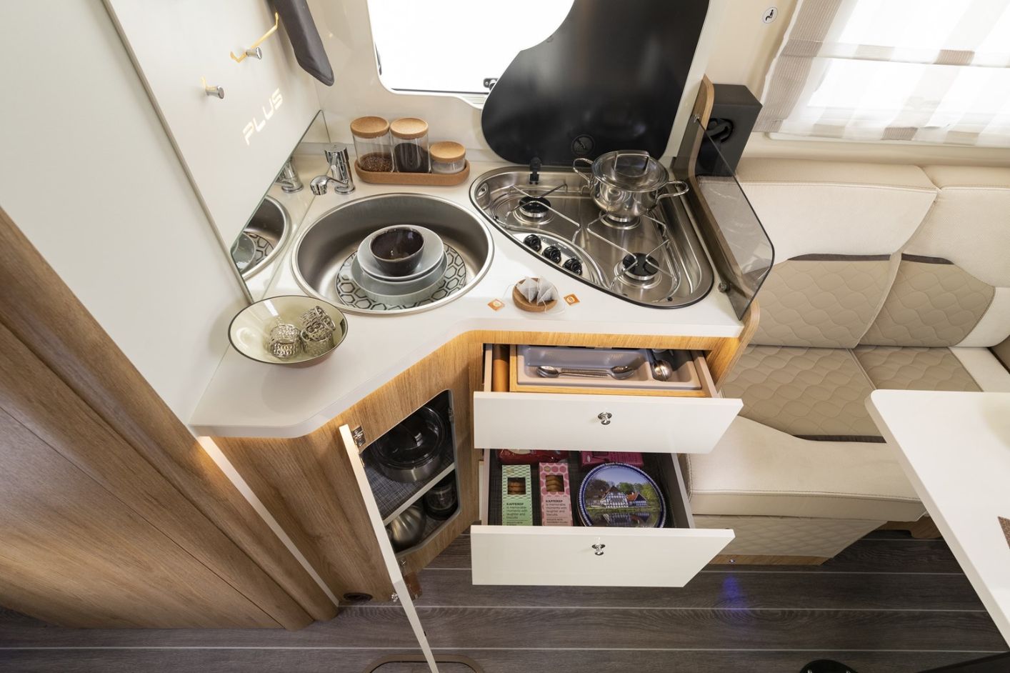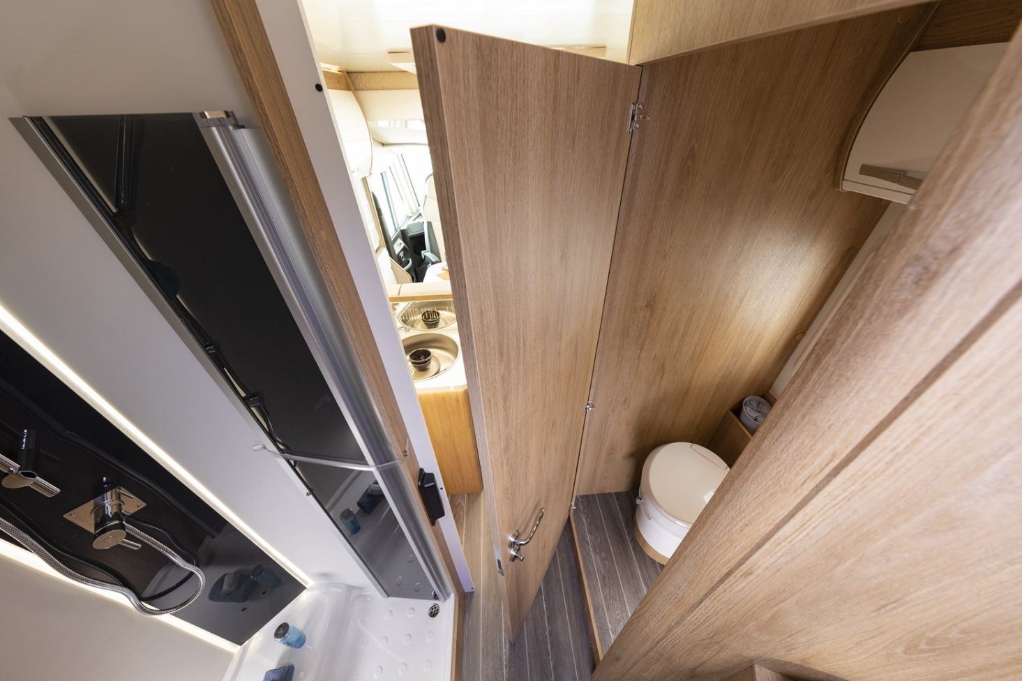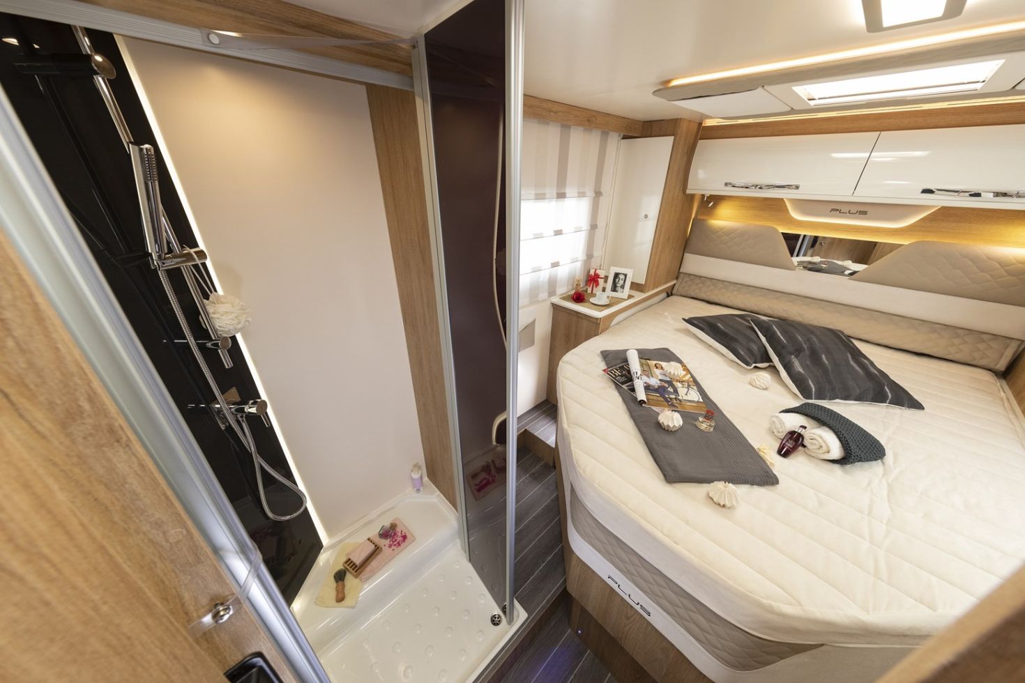 I pensili, installati con uno spazio dalla parete del camper, favoriscono una circolazione dell'aria ottimale, mentre pannelli anticondensa e reti a doghe su tutti i letti garantiscono una ventilazione costante. Anche il design dei materassi è stato attentamente studiato, con una parte inferiore in tessuto tecnico traspirante e una superiore in poliestere trapuntato per il massimo comfort durante il riposo.