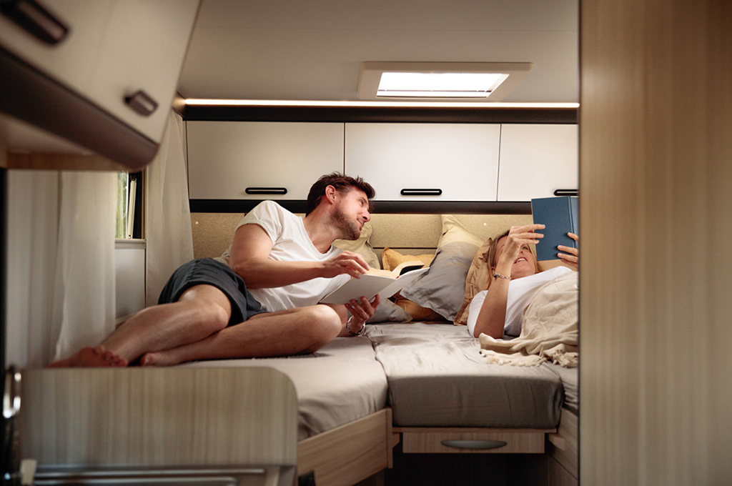 Sun Living Serie C si distingue per offrire un'esperienza di viaggio senza compromessi, dove il comfort e la funzionalità si fondono armoniosamente. Uno dei punti di forza di questi veicoli è rappresentato dai letti, progettati per garantire il massimo relax durante il riposo. Con materassi che possono raggiungere una lunghezza fino a 210 cm, anche le persone più alte possono godere di una notte di sonno rigenerante.