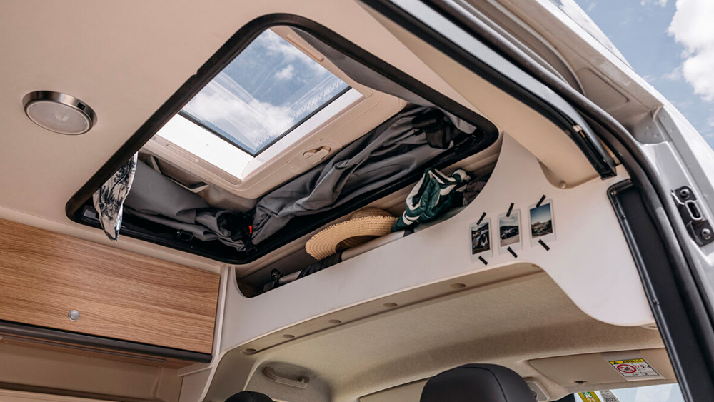 Ciò che distingue il Cliff 640 RT è il suo tetto sollevabile, il più grande nella zona notte dell'intero settore dei camper, che trasforma lo spazio interno in un ambiente arioso e spazioso. Questo permette di godere di più comodità e libertà durante il viaggio, consentendo agli occupanti di mantenere la sensazione di slancio anche quando sono all'interno del veicolo.